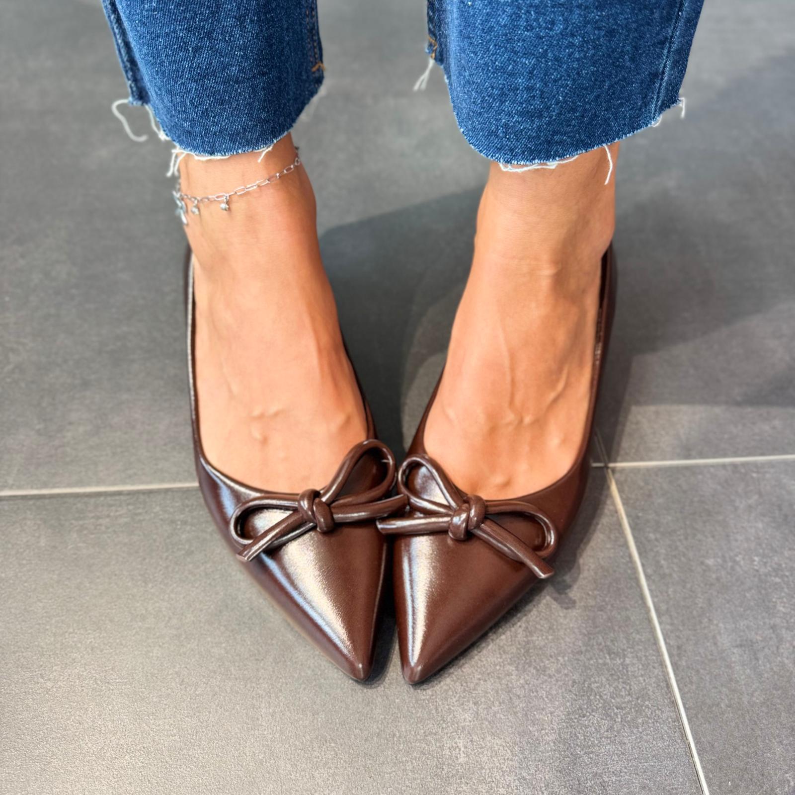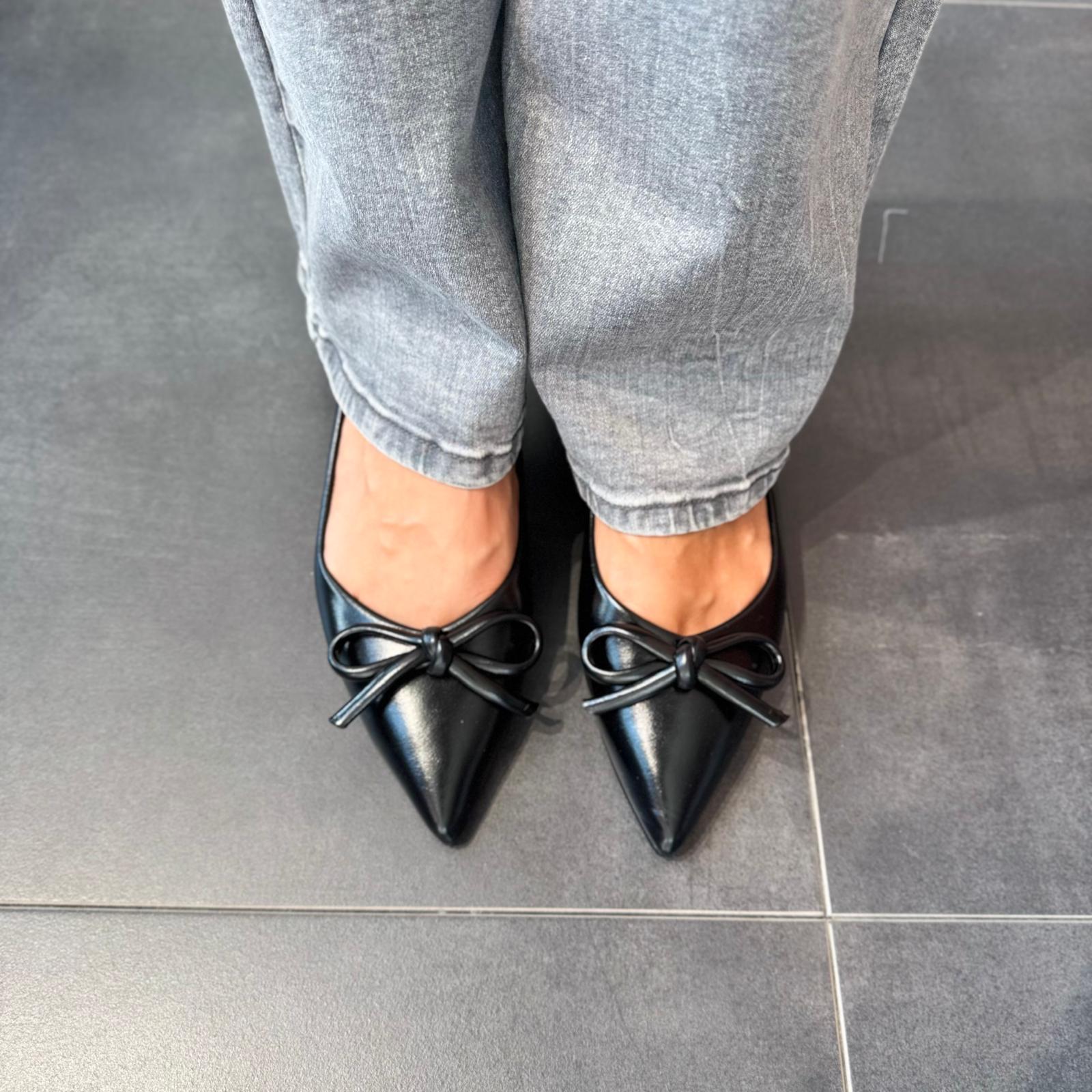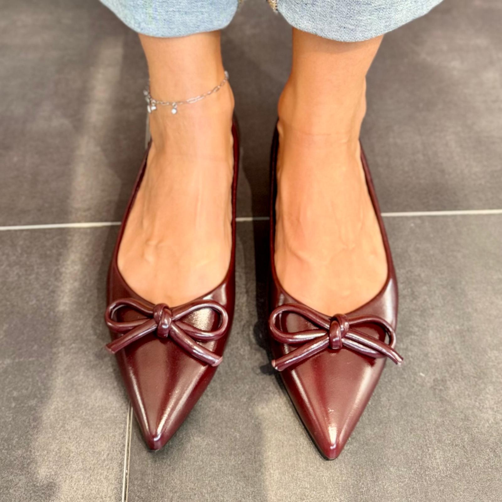 Ballerina dal fascino senza tempo, ispirata allo stile rétro, realizzata in ecopelle lucida con punta affusolata e delicato fiocco decorativo. Il tacco basso da 4 cm dona un tocco di eleganza e comfort, perfetto per l’uso quotidiano.