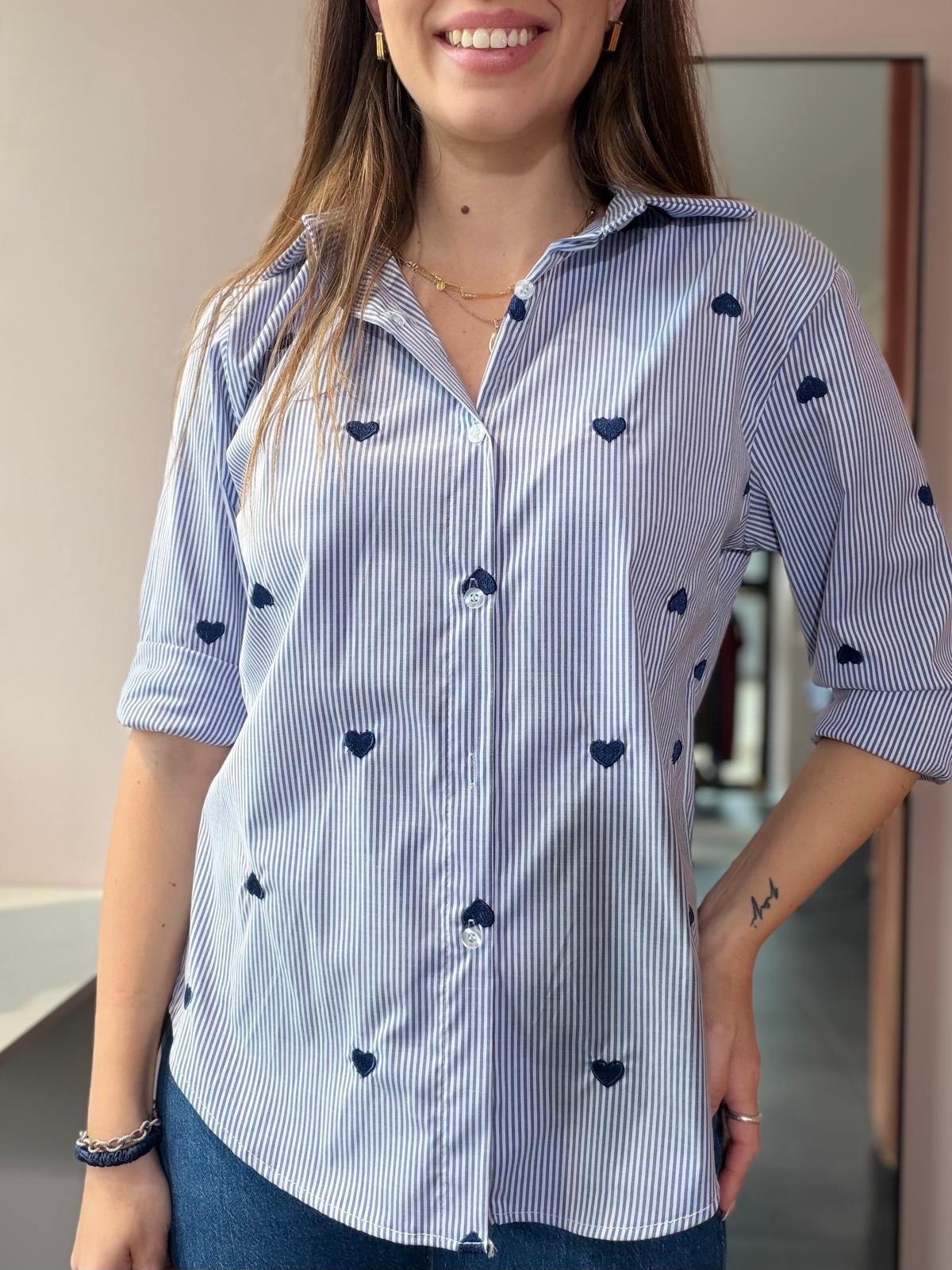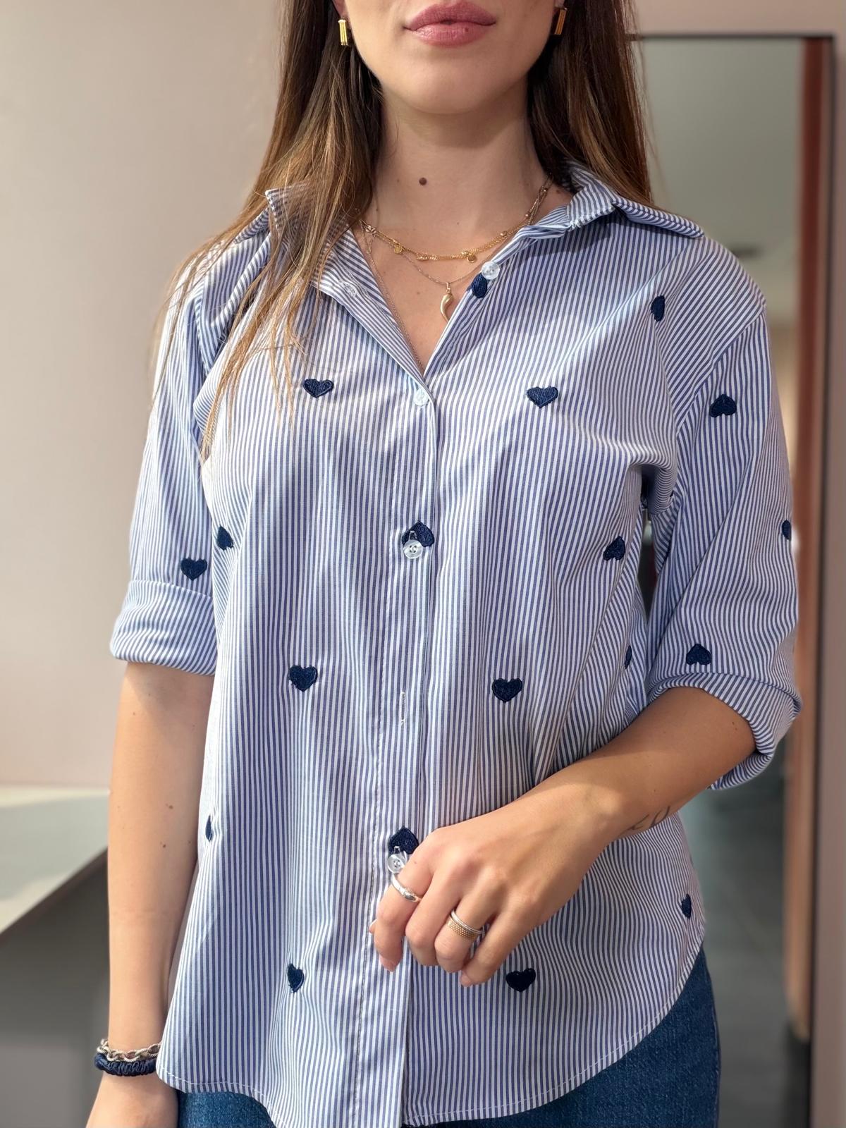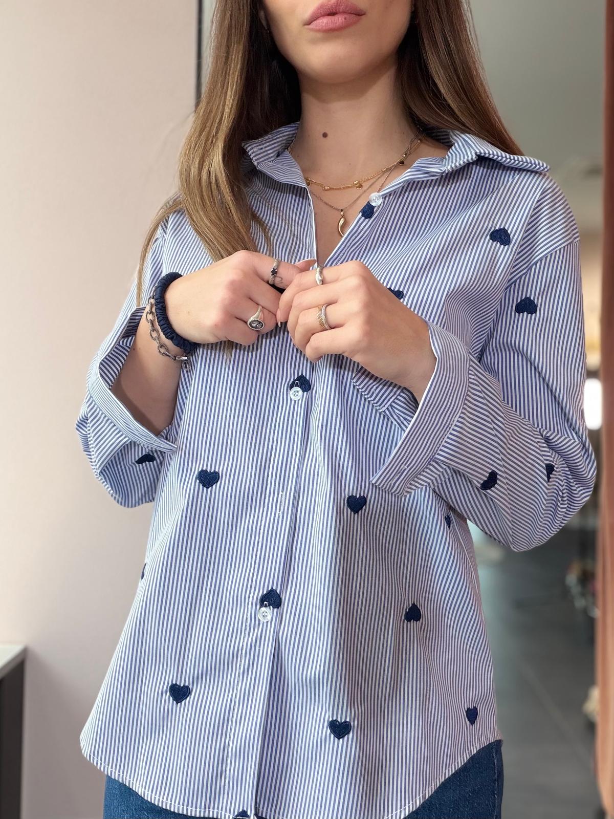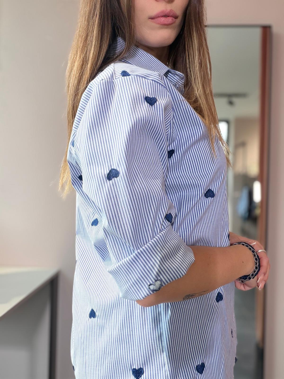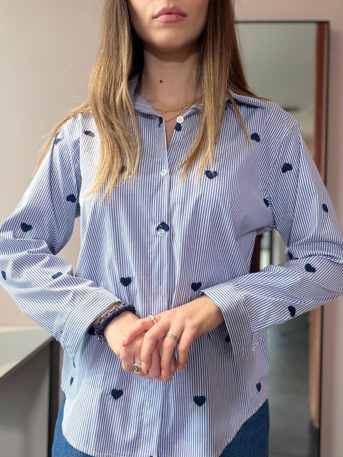 Camicia a righe con cuoricini ricamati su tutta la texture, un capo originale e versatile perfetto per completare look quotidiani curati e femminili.