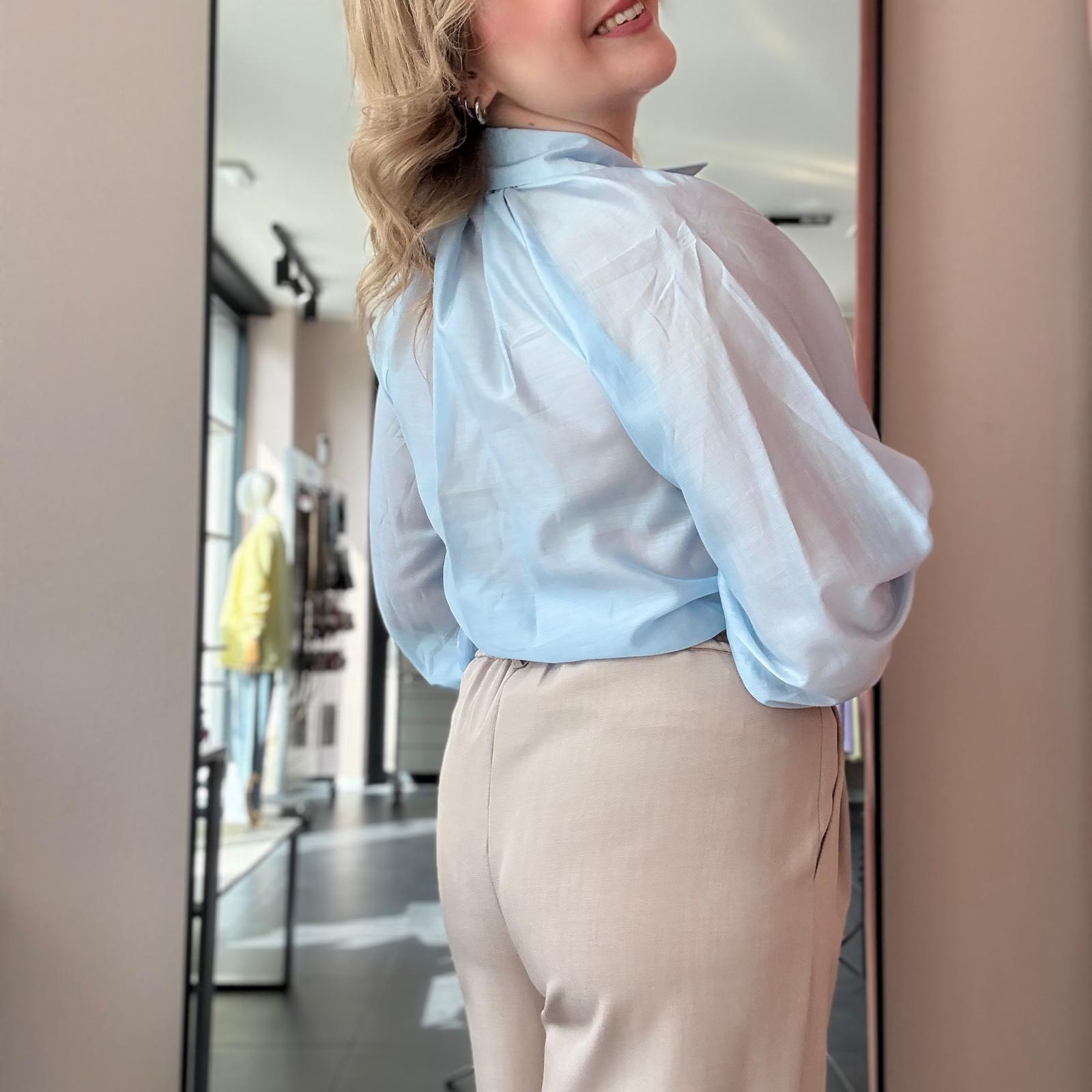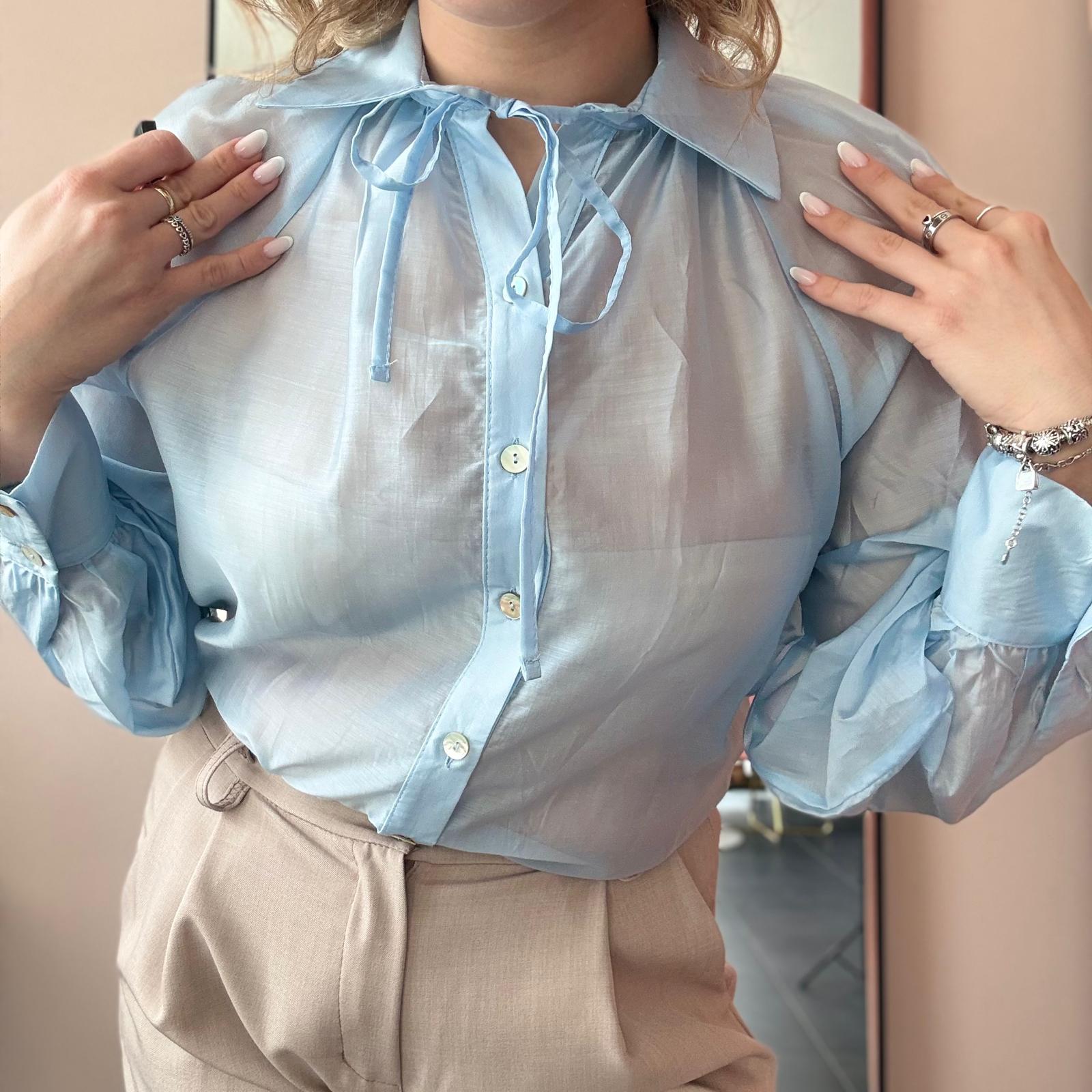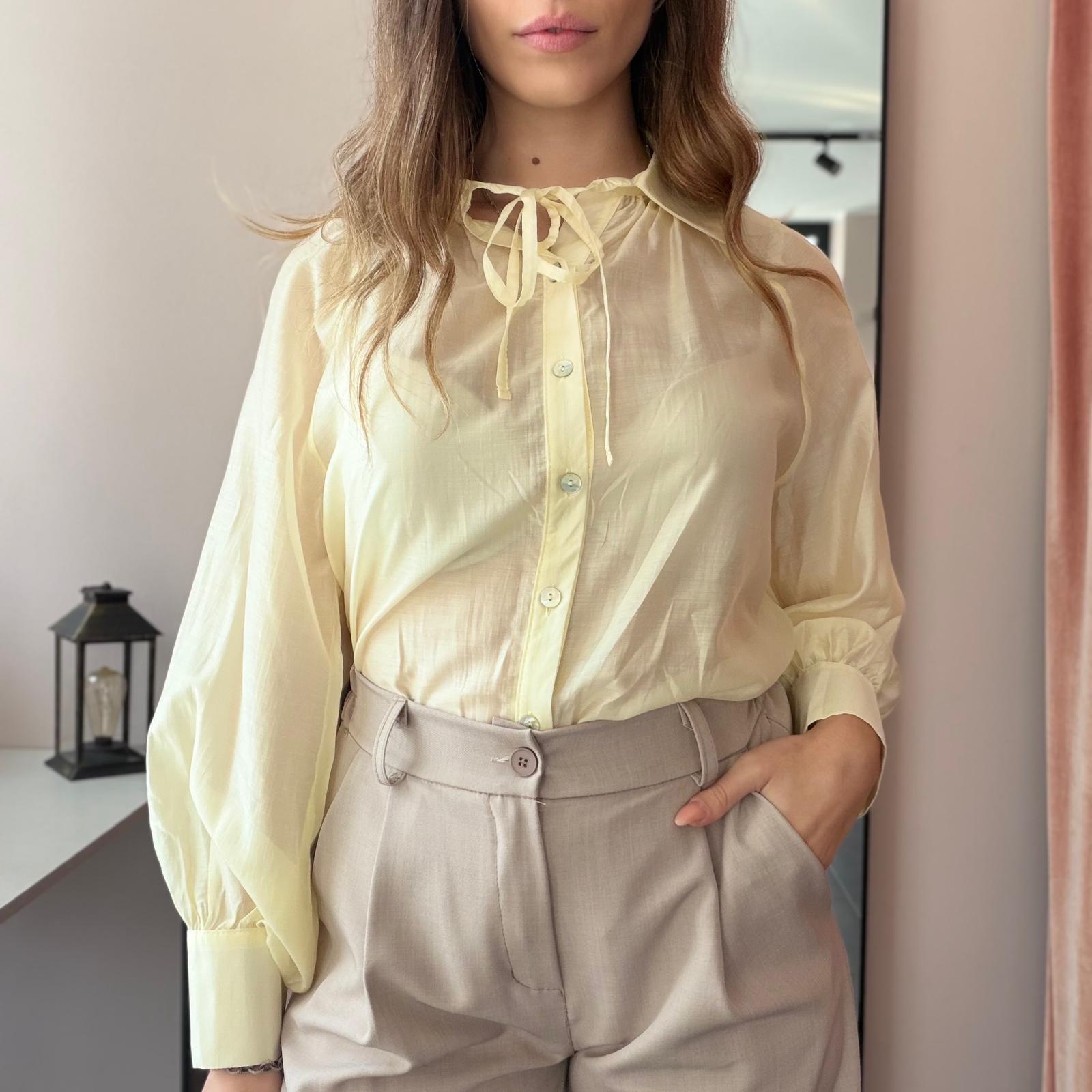 Il design raffinato comprende un colletto con rouches, maniche a sbuffo con polsini rigidi e alti e bottoni in chiusura fino al collo, per uno stile classico e femminile. Perfetta da abbinare a pantaloni a vita alta per valorizzare la silhouette e creare look eleganti e ricercati.