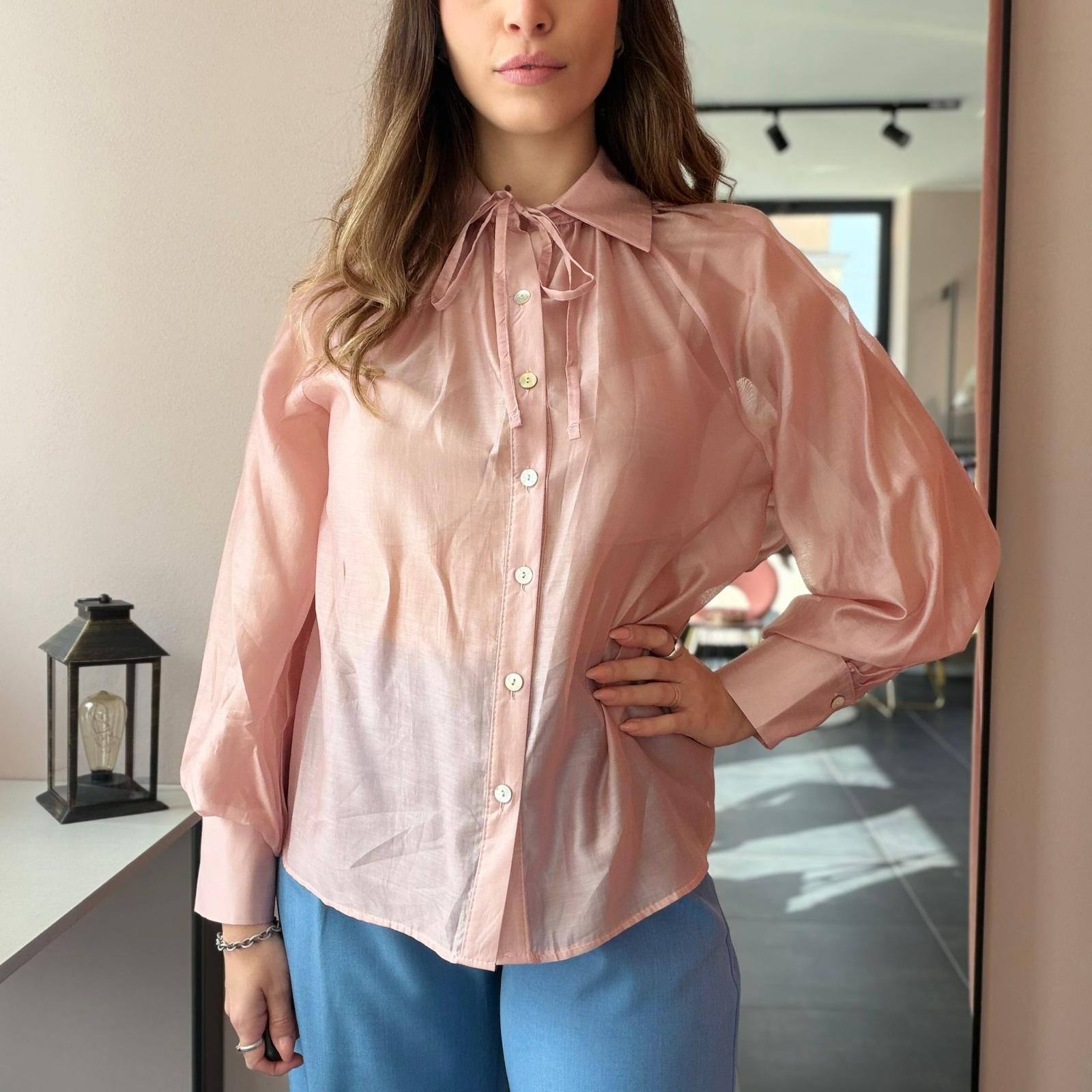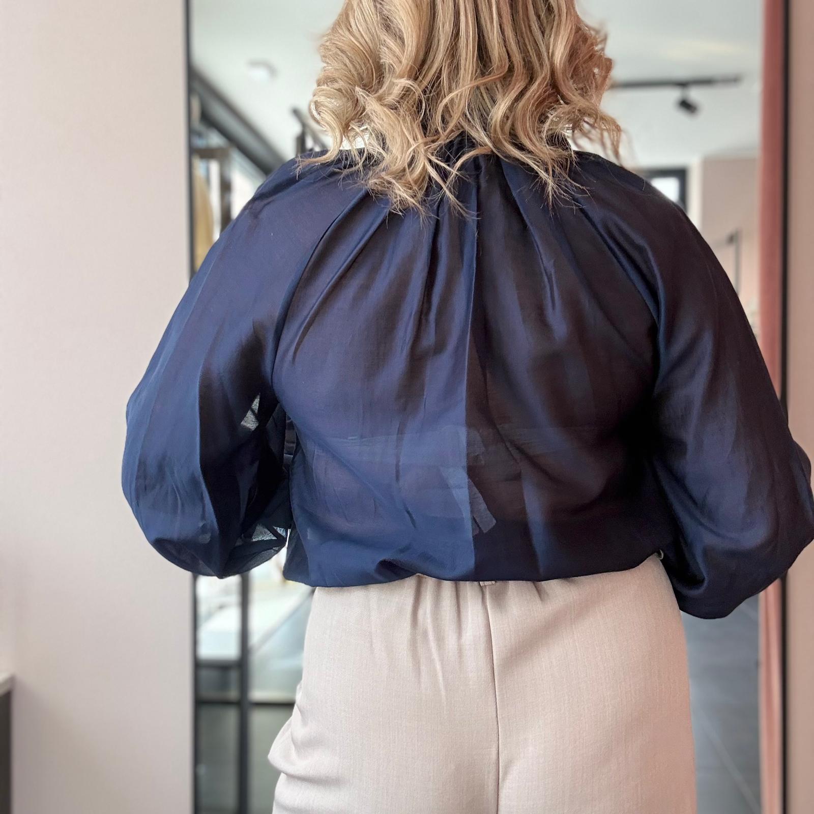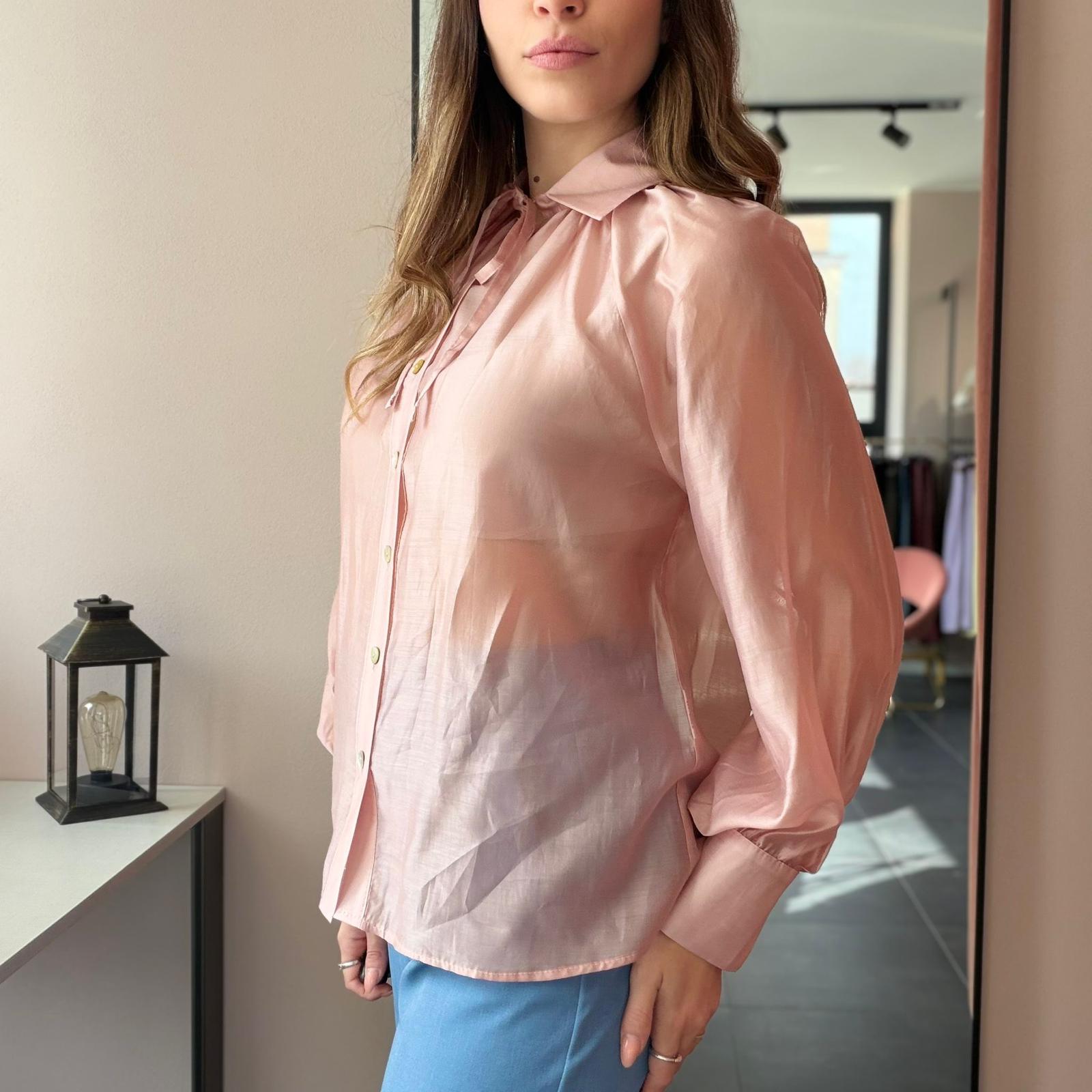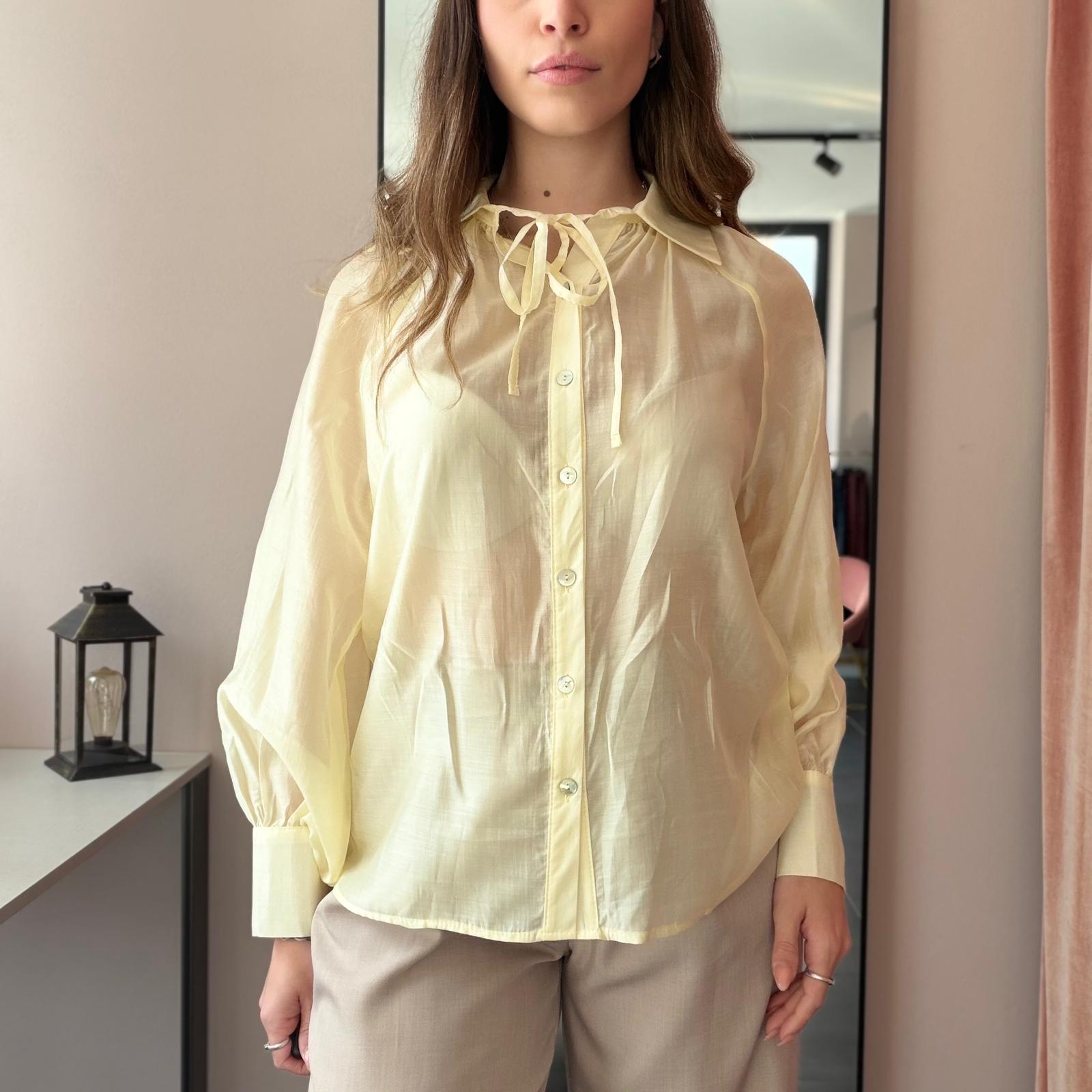 Il design raffinato comprende un colletto con rouches, maniche a sbuffo con polsini rigidi e alti e bottoni in chiusura fino al collo, per uno stile classico e femminile. Perfetta da abbinare a pantaloni a vita alta per valorizzare la silhouette e creare look eleganti e ricercati.