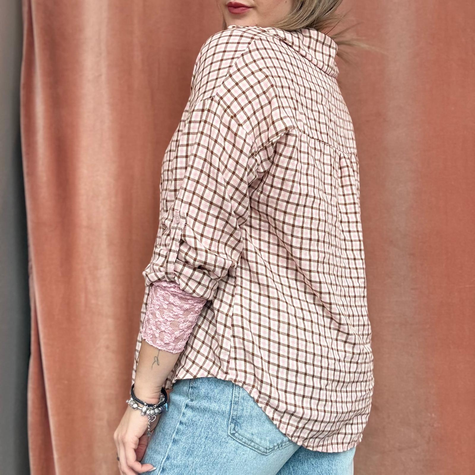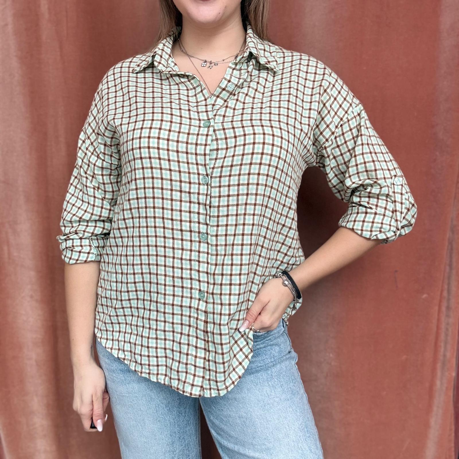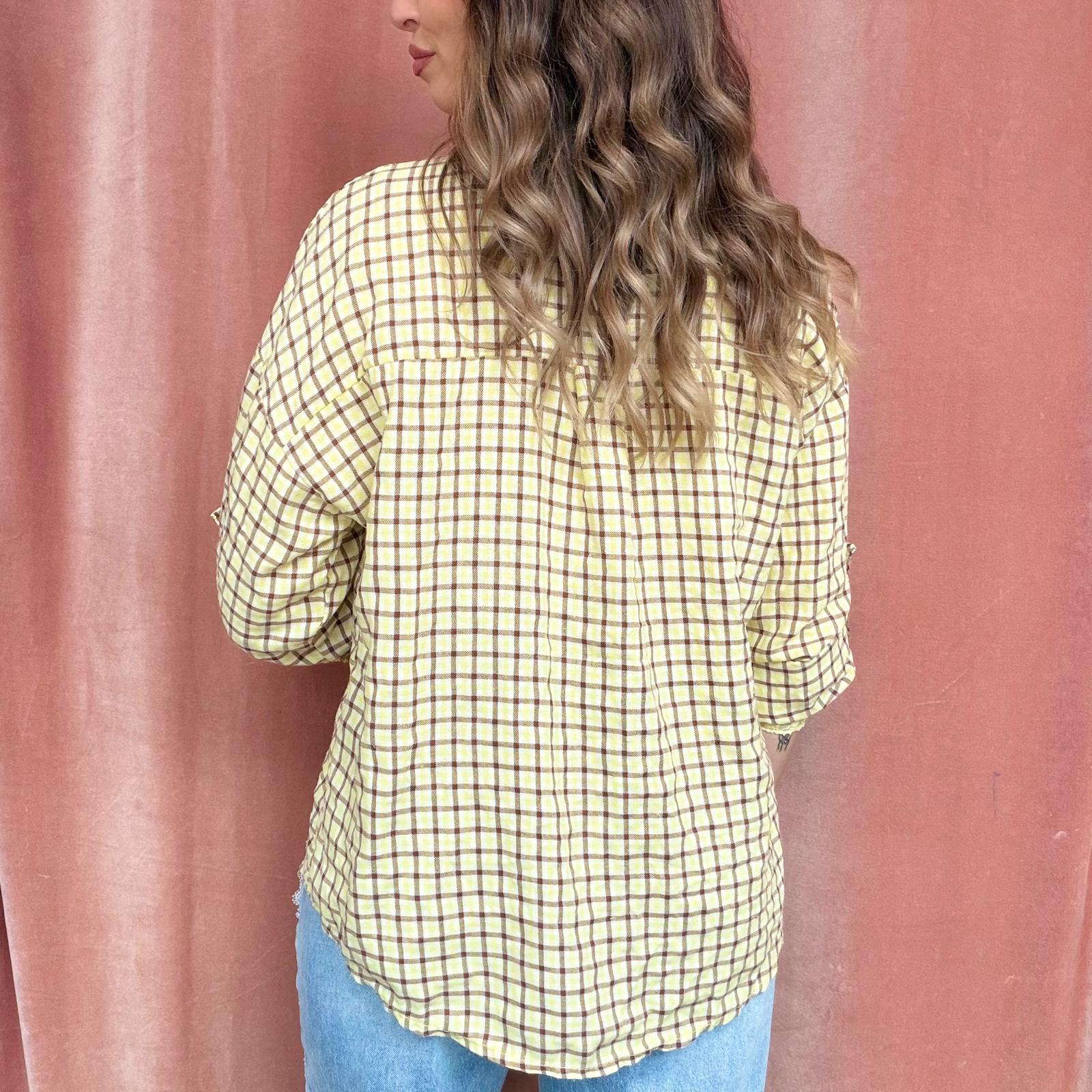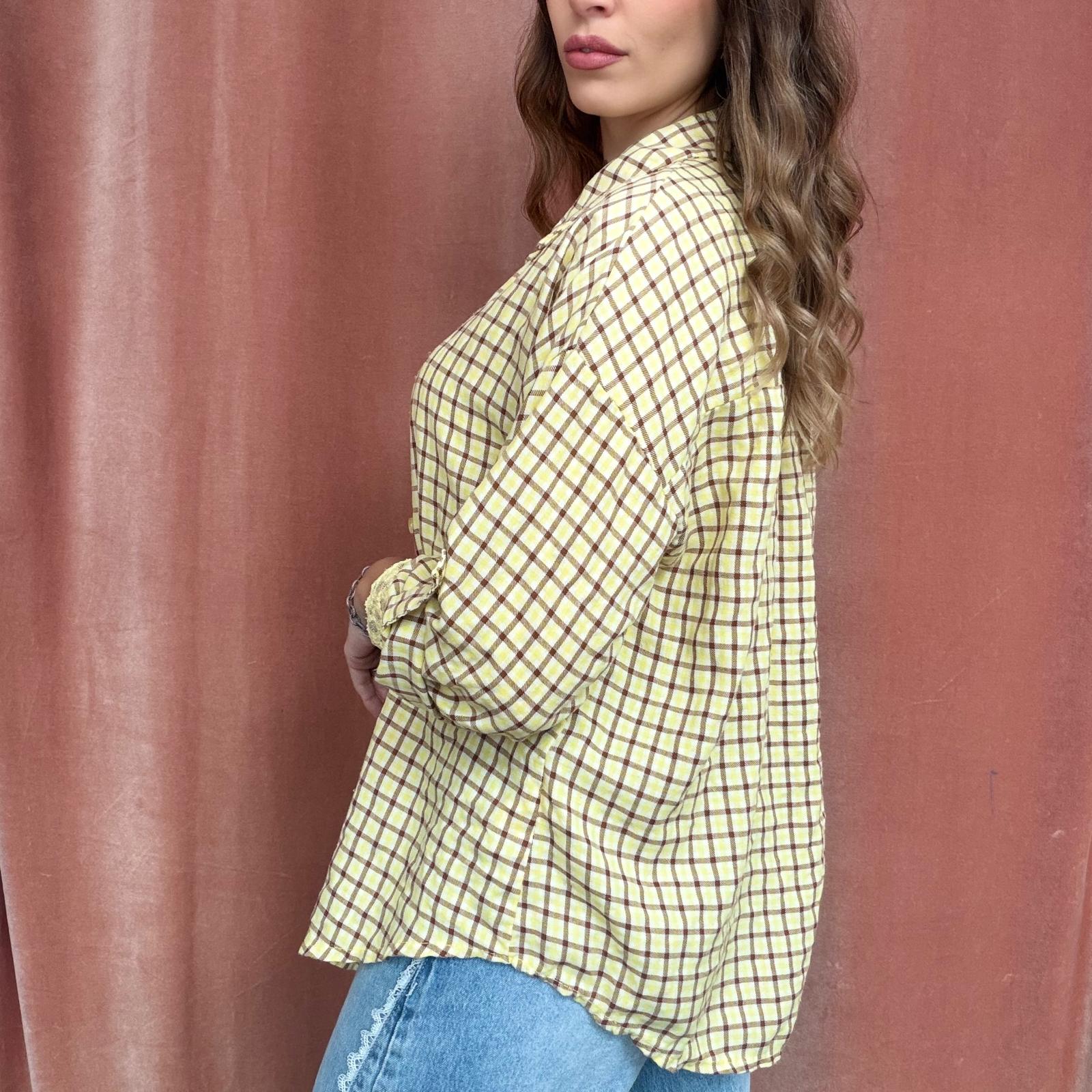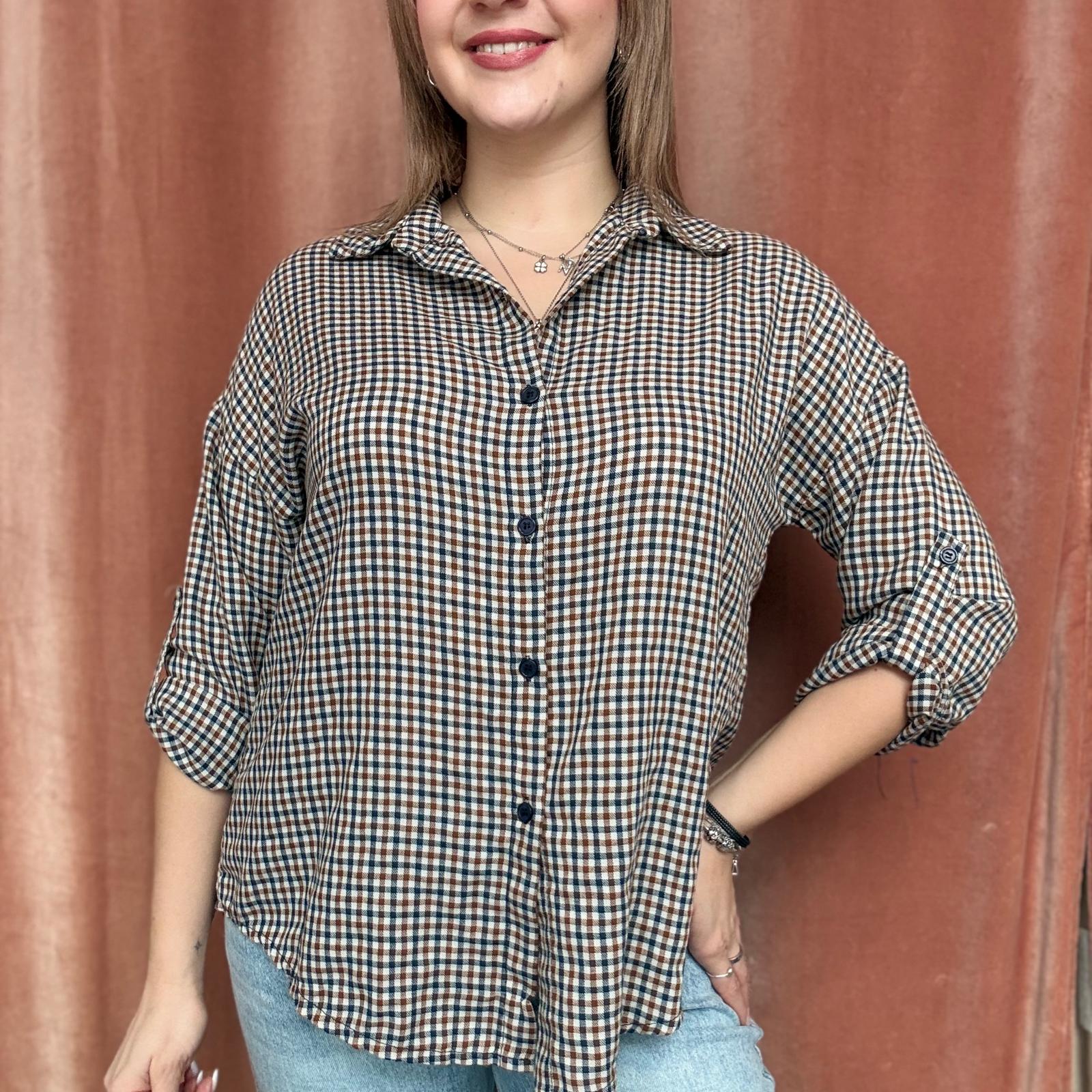 Camicia a piccoli quadri stile scozzese, proposta in colorazioni primaverili come giallo, verde acqua, rosa e altre tonalità luminose. Il modello presenta maniche 3/4 regolabili, trasformabili in manica lunga, e chiusura frontale con bottoncini.