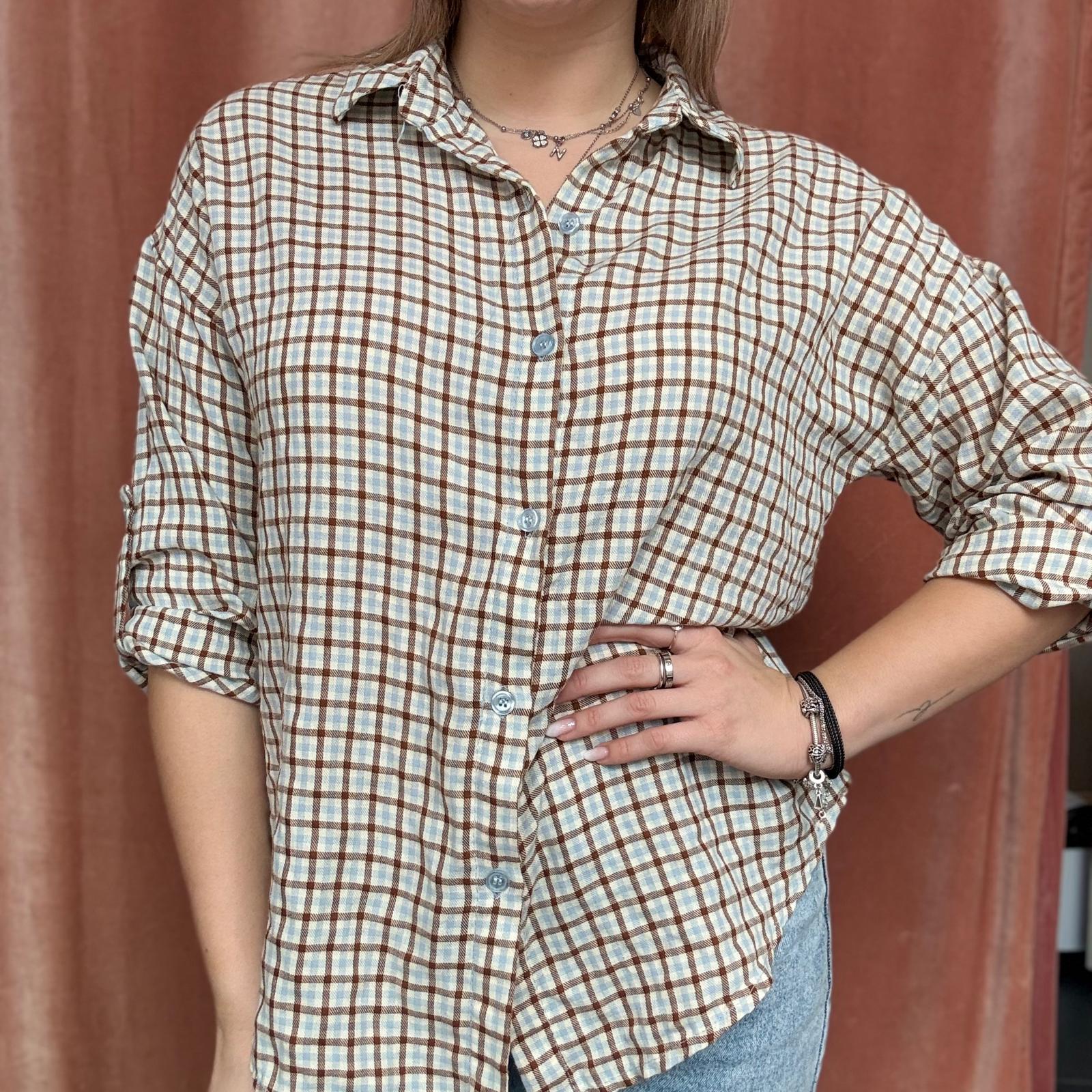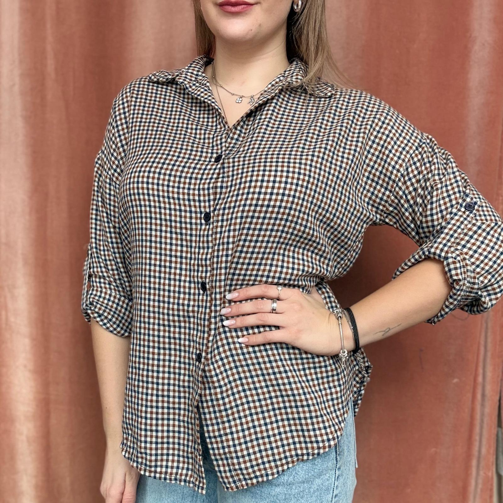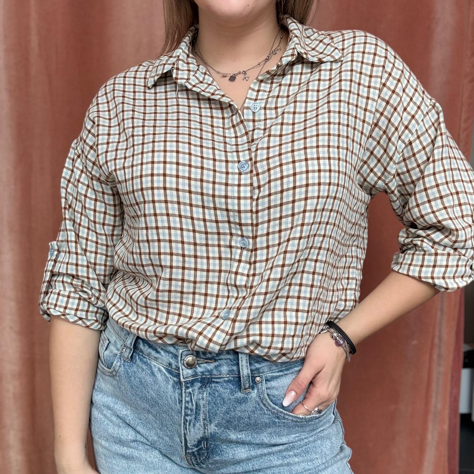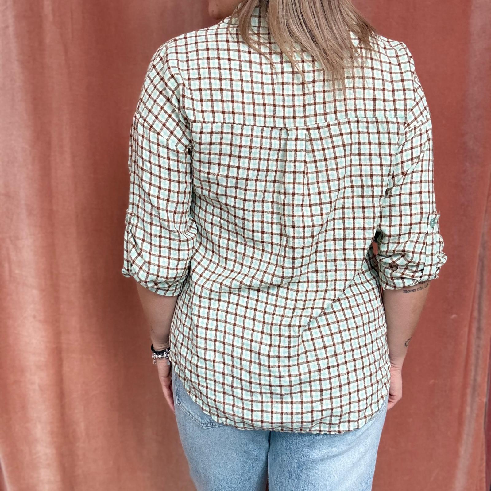 Camicia a piccoli quadri stile scozzese, proposta in colorazioni primaverili come giallo, verde acqua, rosa e altre tonalità luminose. Il modello presenta maniche 3/4 regolabili, trasformabili in manica lunga, e chiusura frontale con bottoncini.