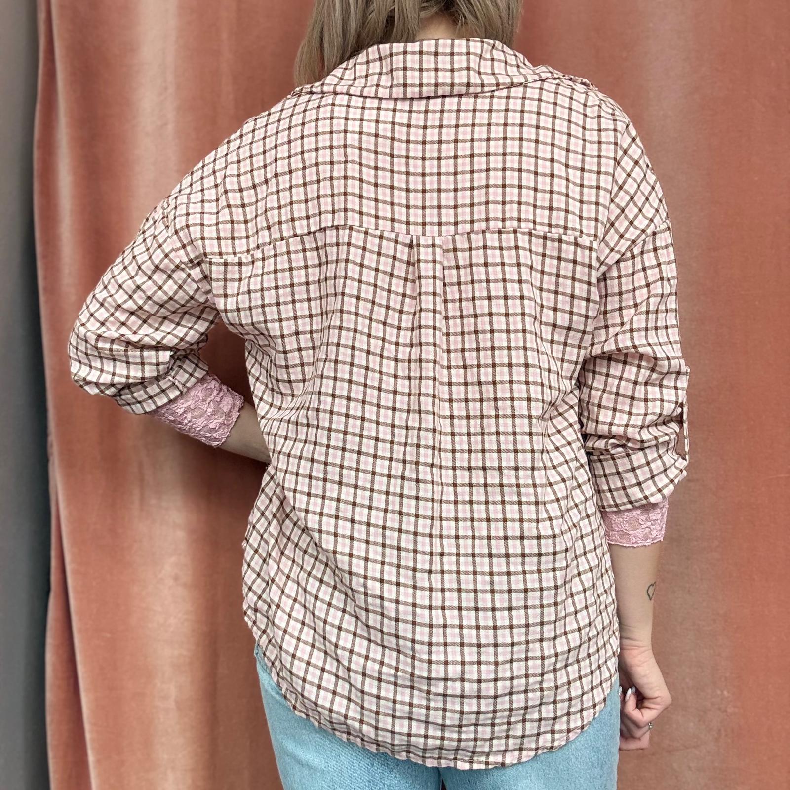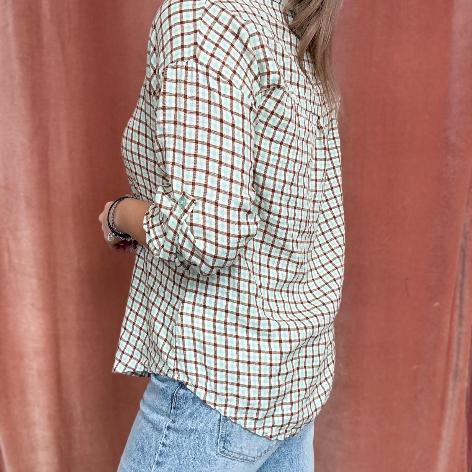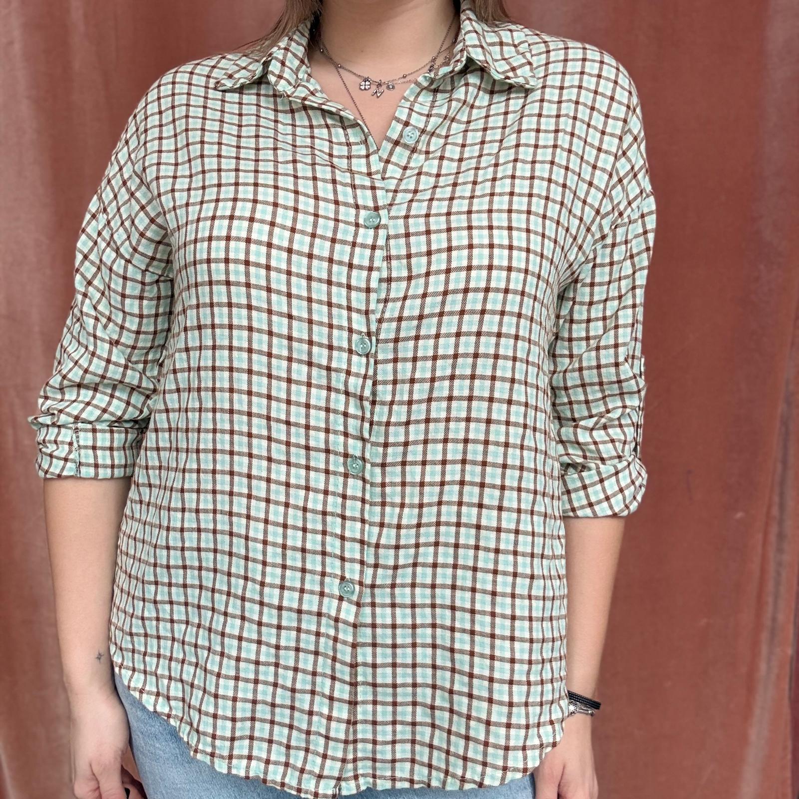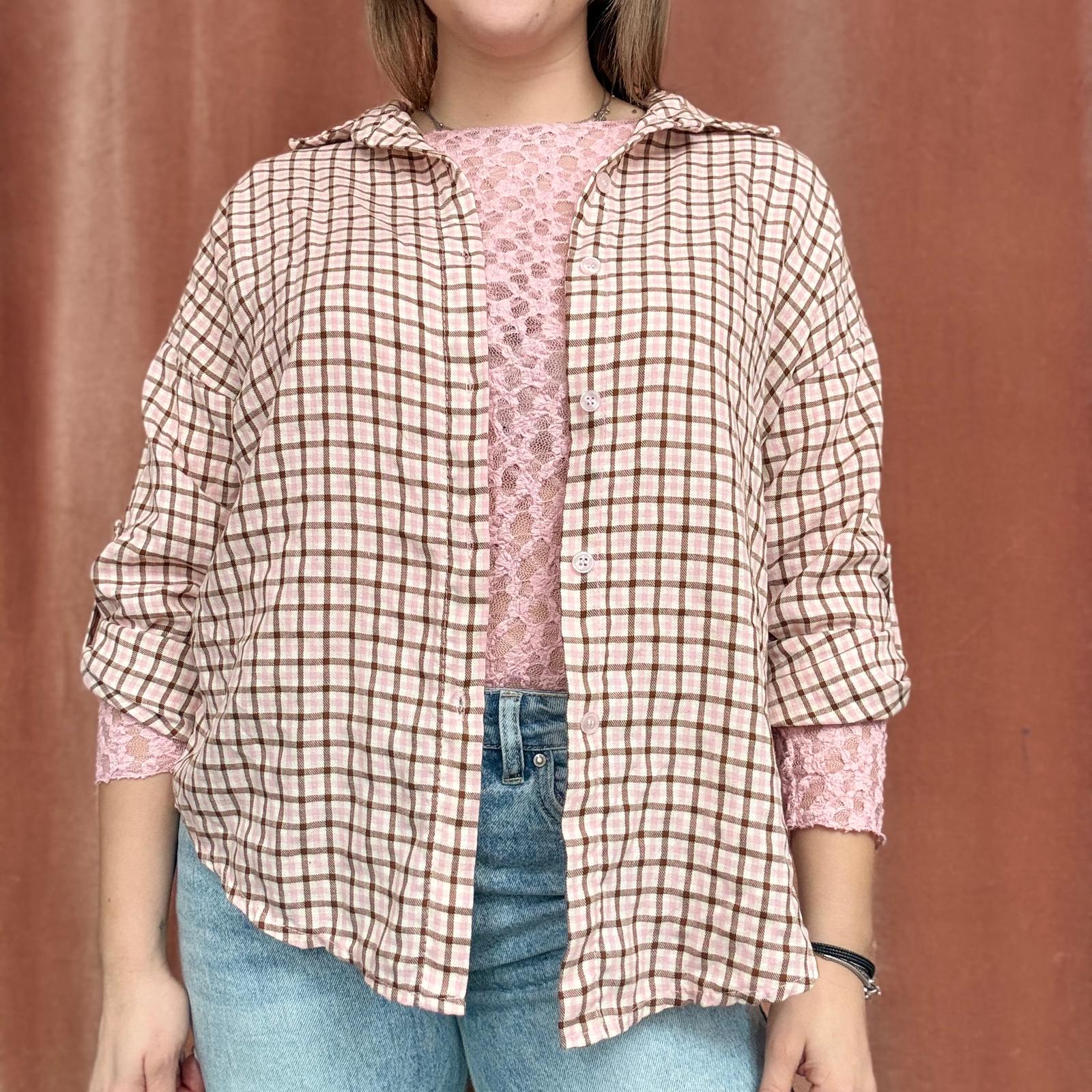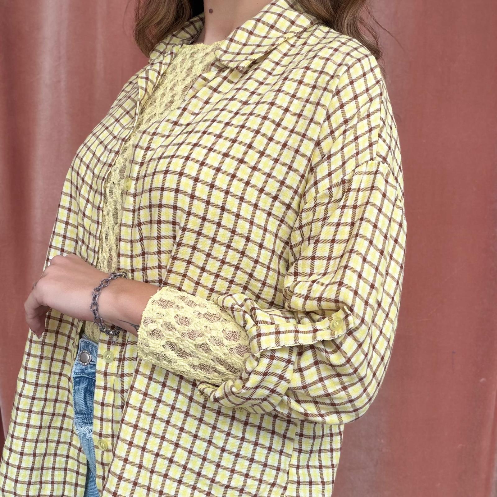 Camicia a piccoli quadri stile scozzese, proposta in colorazioni primaverili come giallo, verde acqua, rosa e altre tonalità luminose. Il modello presenta maniche 3/4 regolabili, trasformabili in manica lunga, e chiusura frontale con bottoncini.