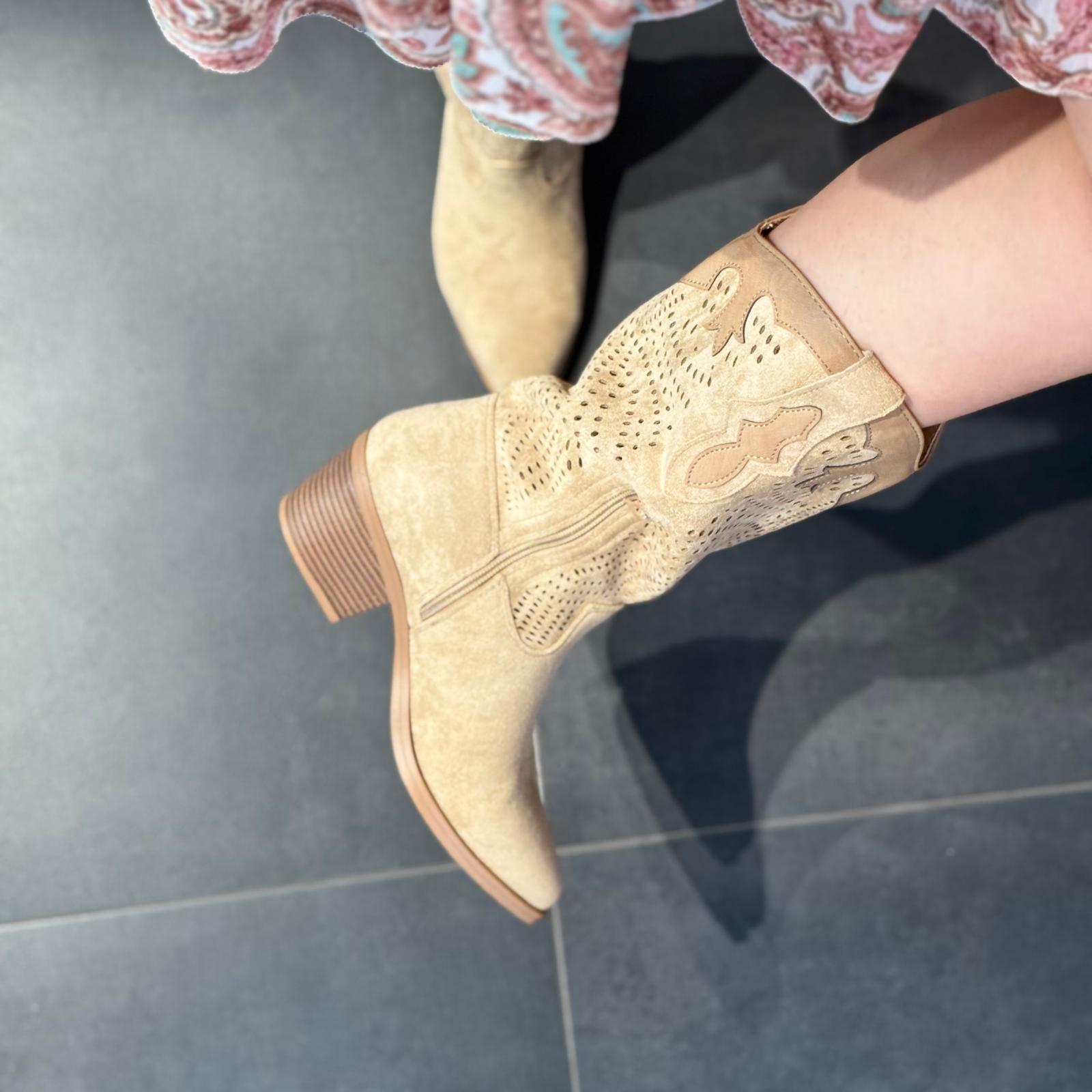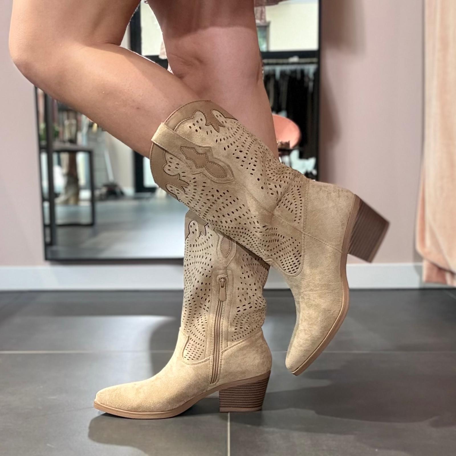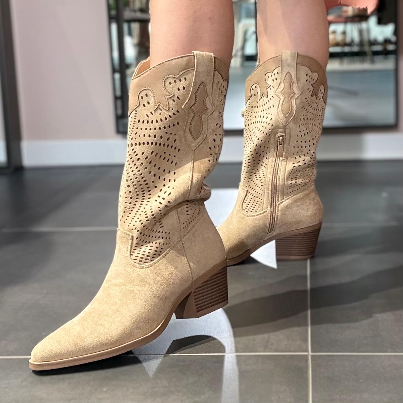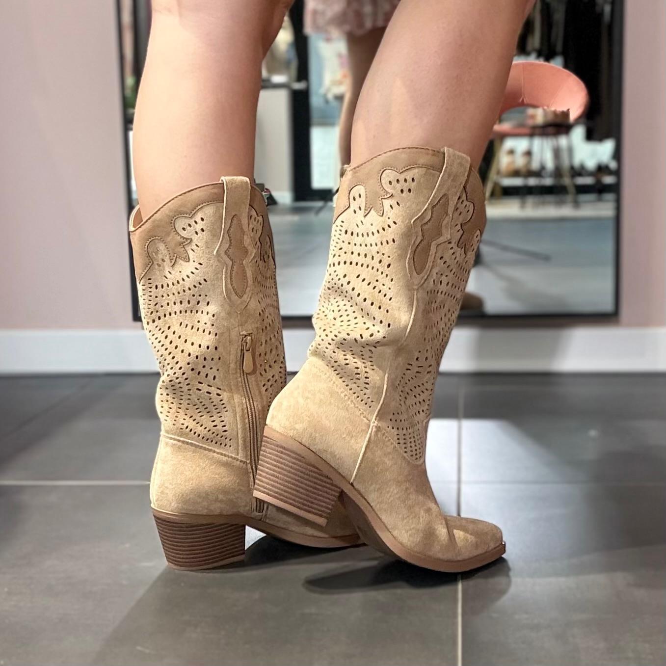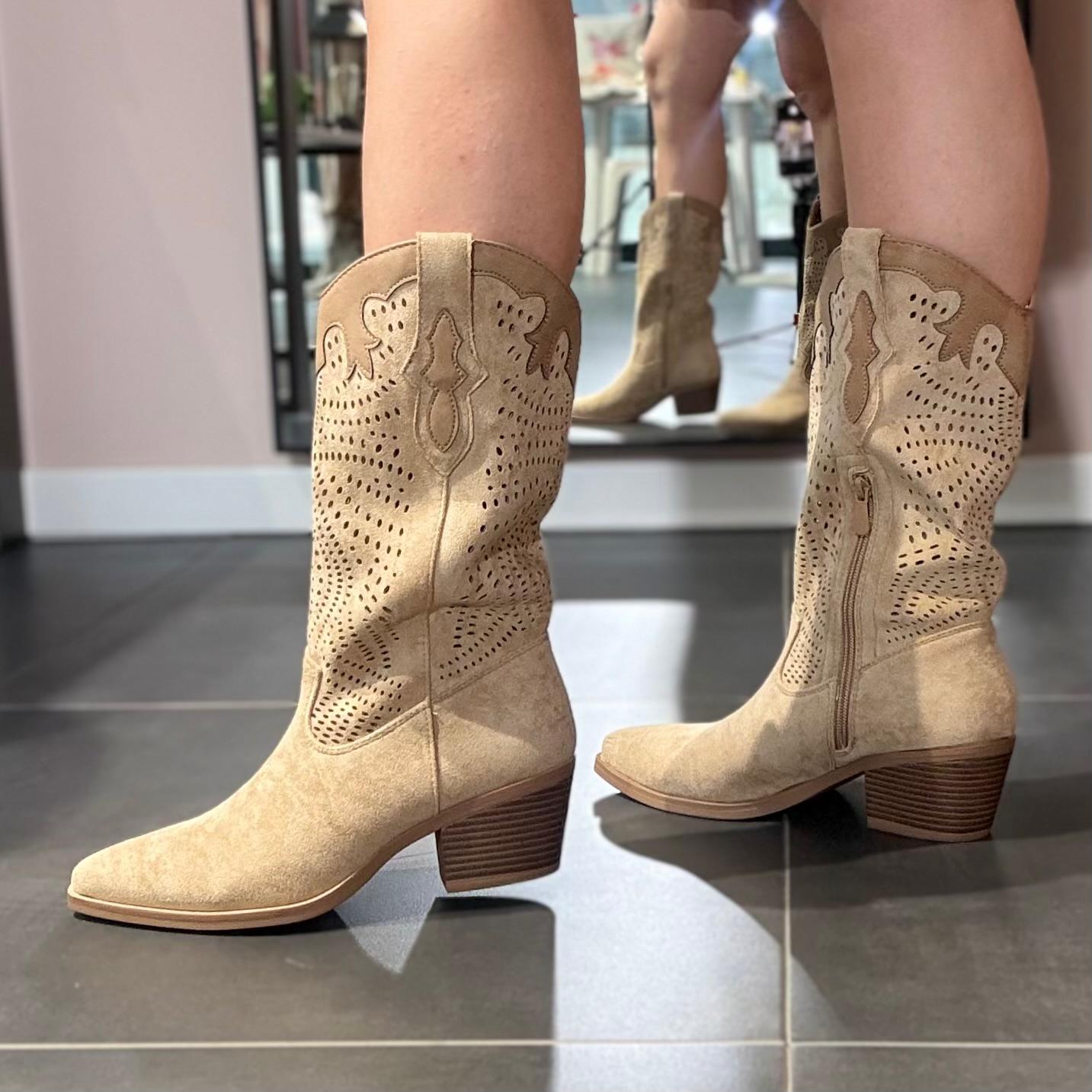 Stivali modello camperos in tonalità beige con lavorazione traforata, un modello femminile e di carattere perfetto per completare i look di stagione con un tocco deciso ma raffinato.