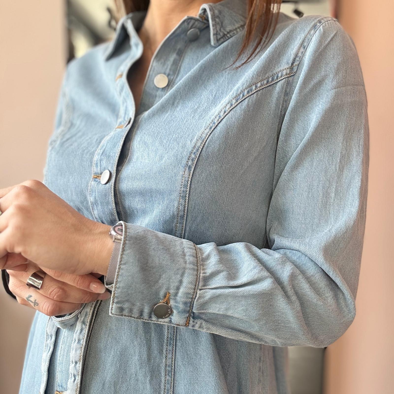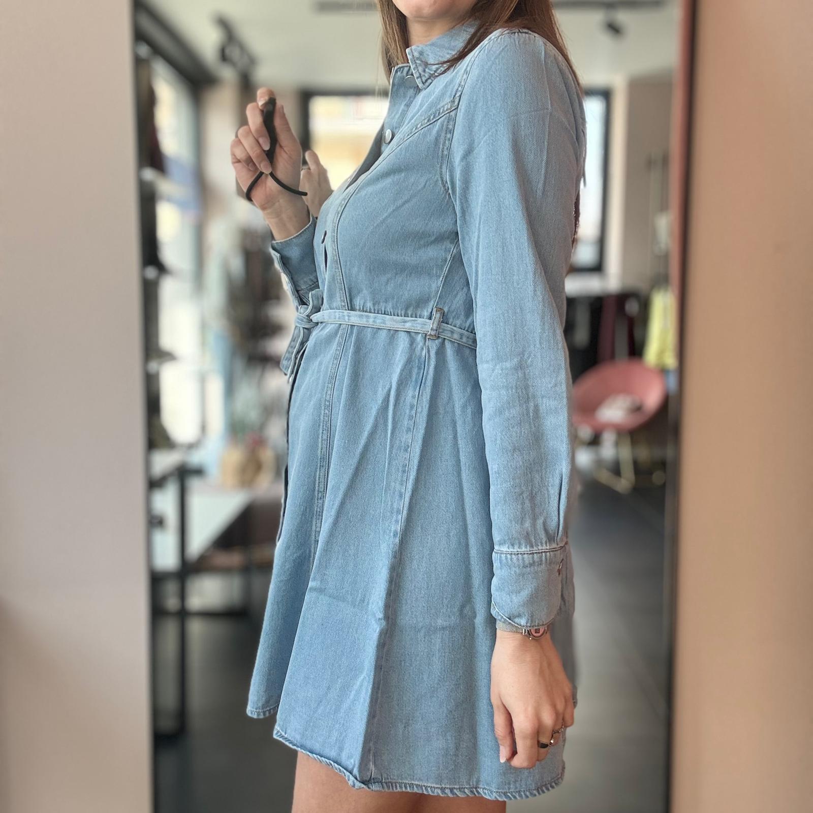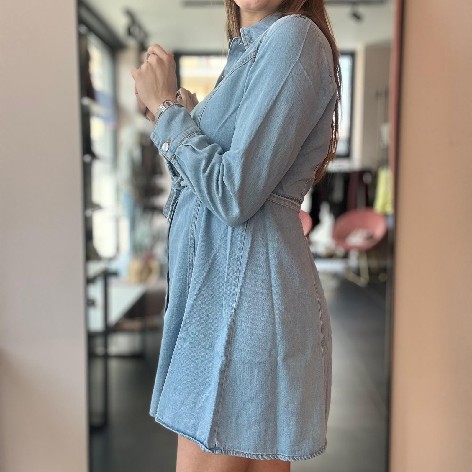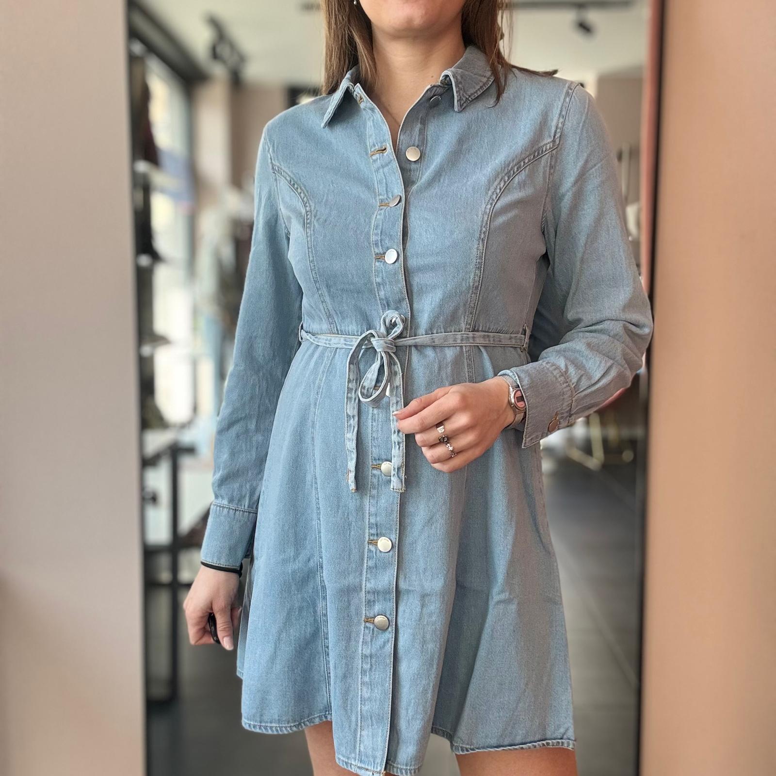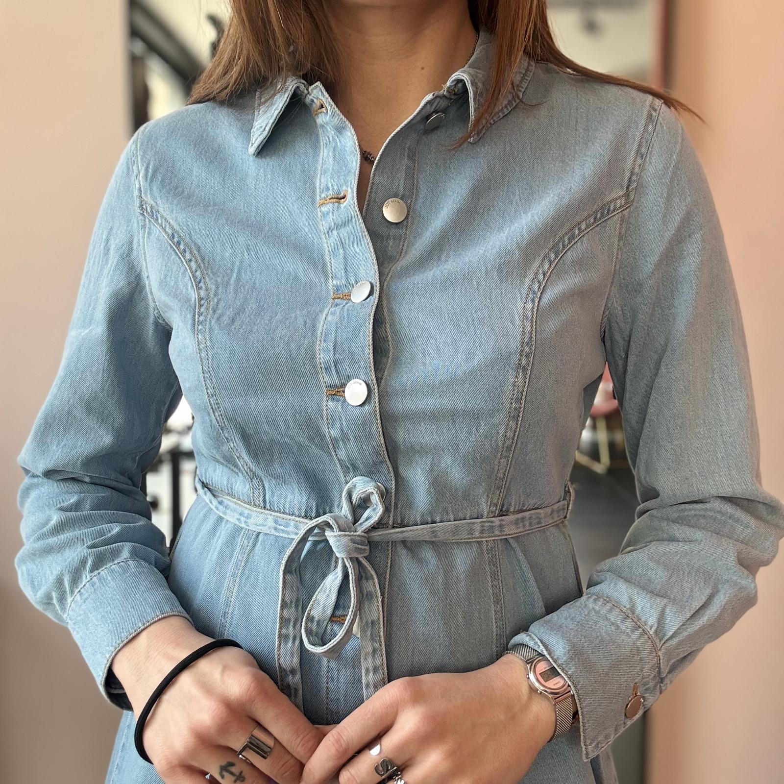 Modello con maniche lunghe, lunghezza regolare e cinturina in denim coordinata da annodare in vita per definire la silhouette.