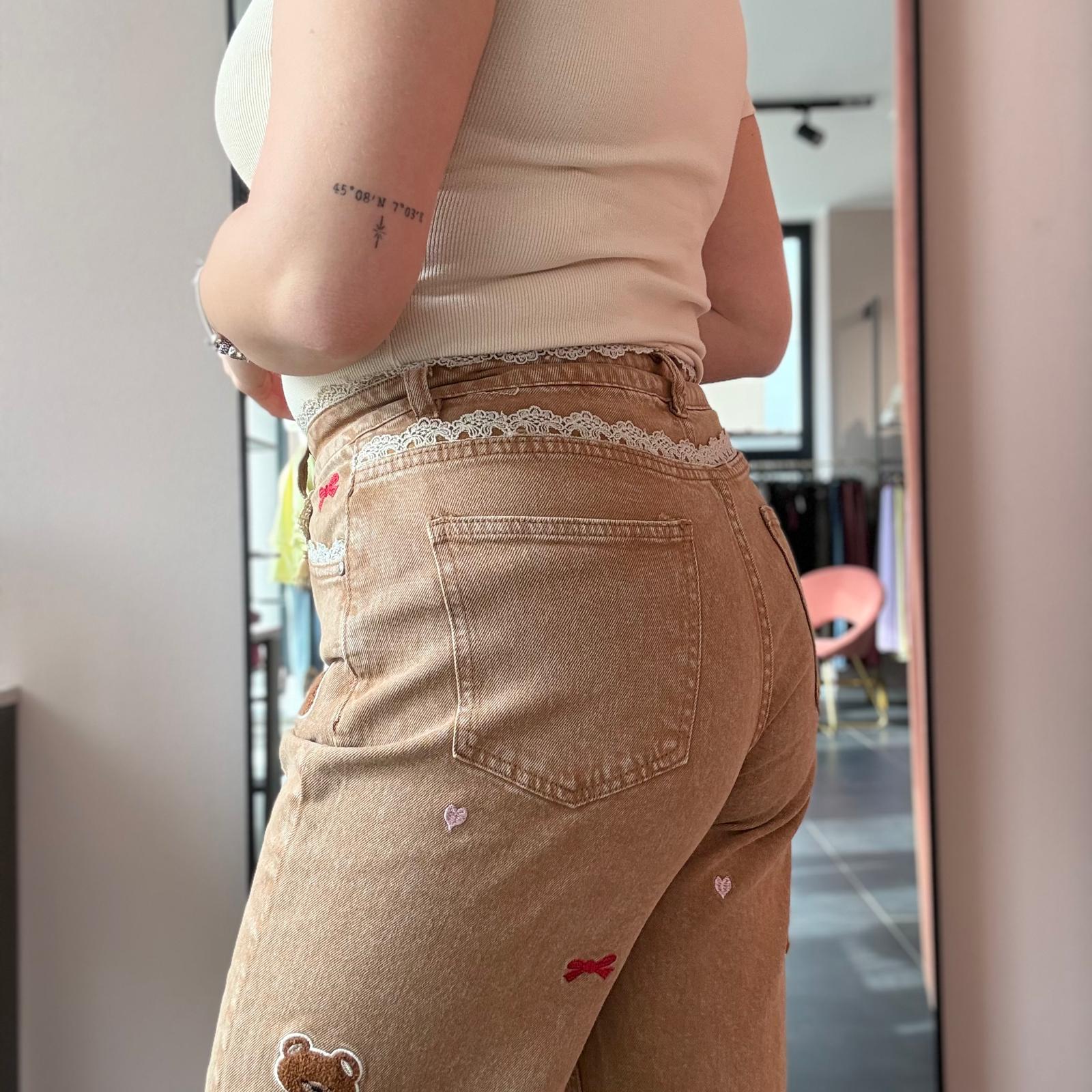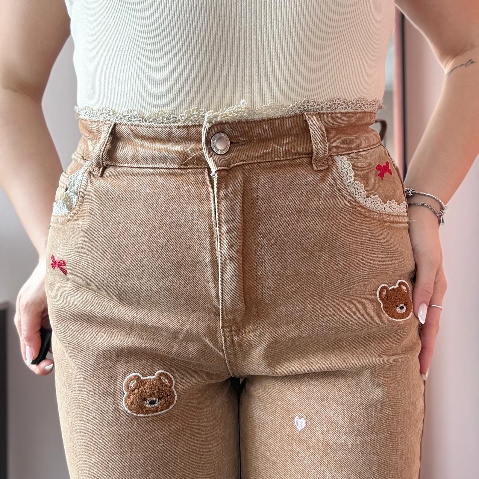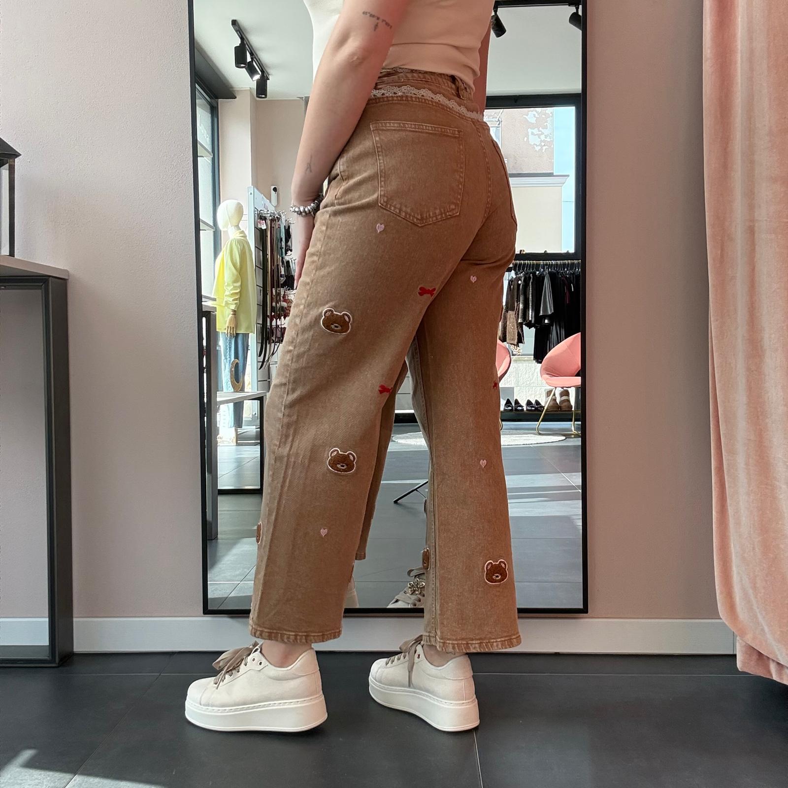Un capo unico che unisce comfort e stile: questi jeans marroni in cotone presentano un patch orsetto e un delicato pizzo ricamato sulle cuciture superiori, in vita e sulle tasche, per un tocco femminile e originale.