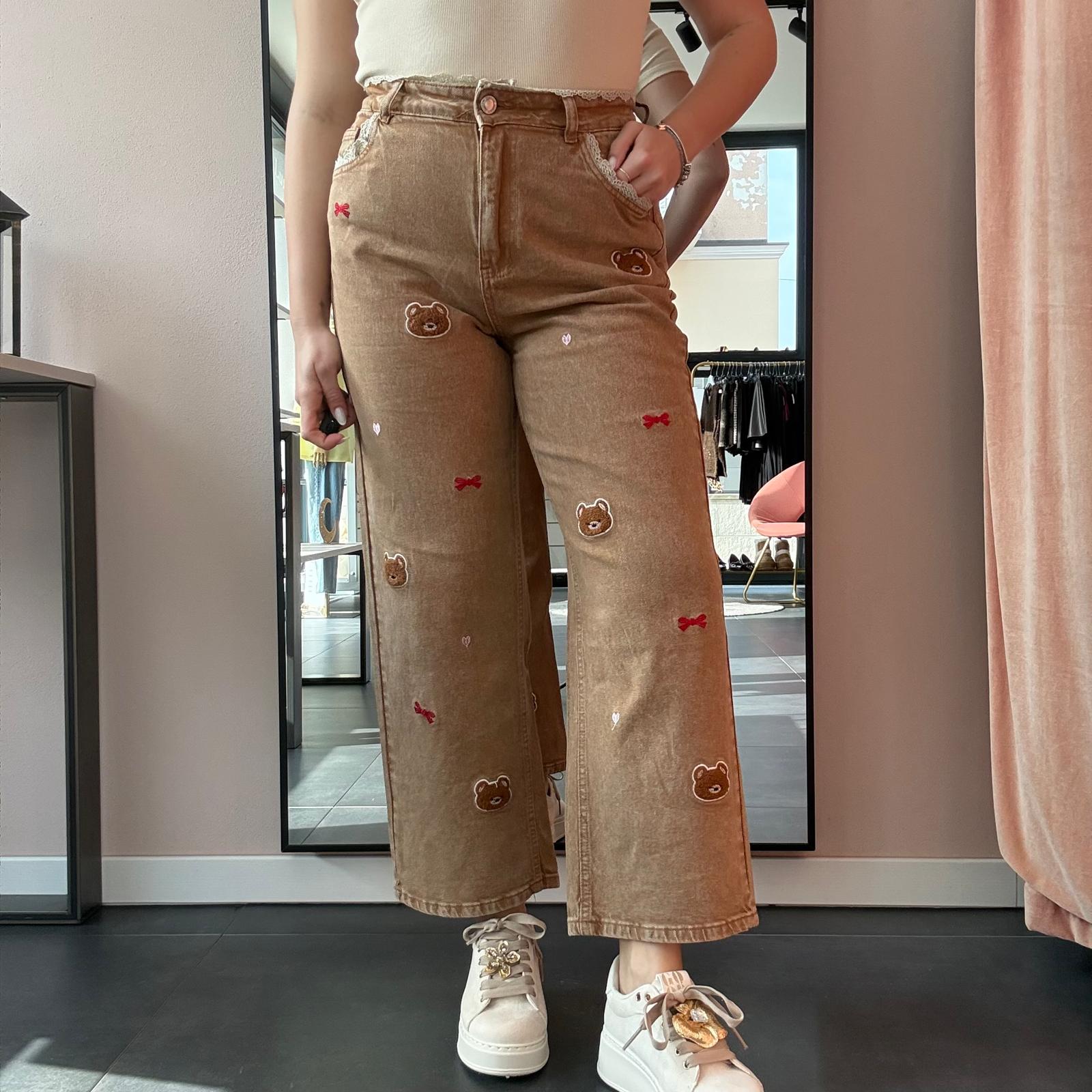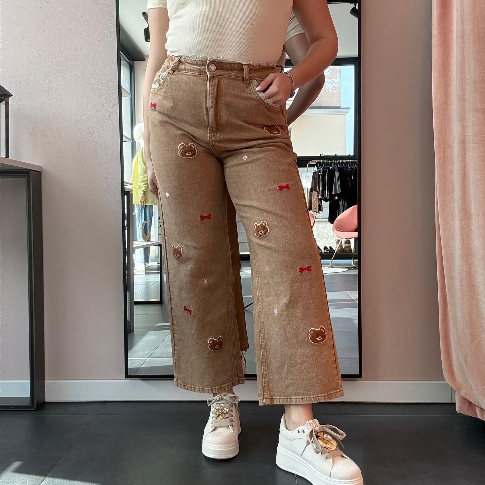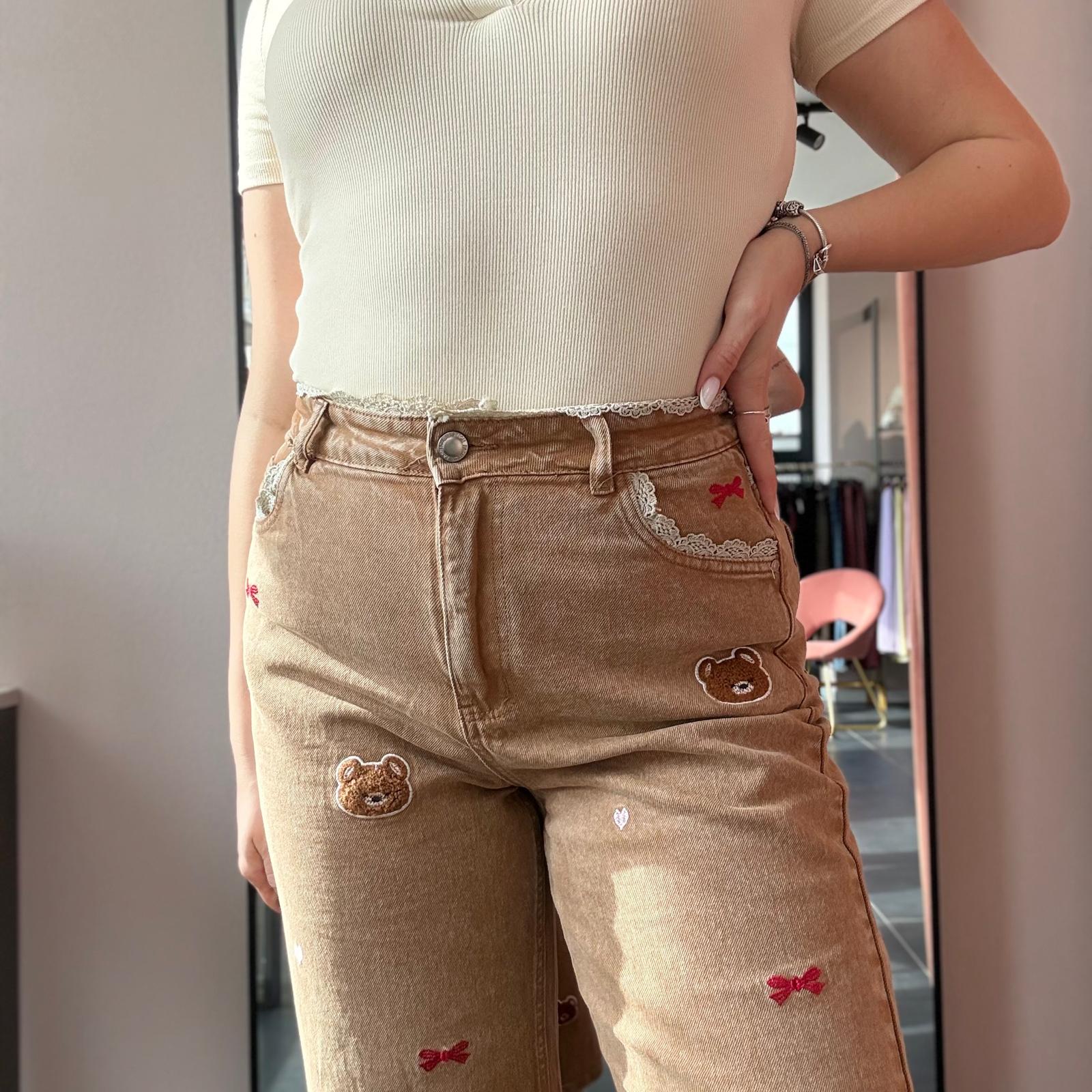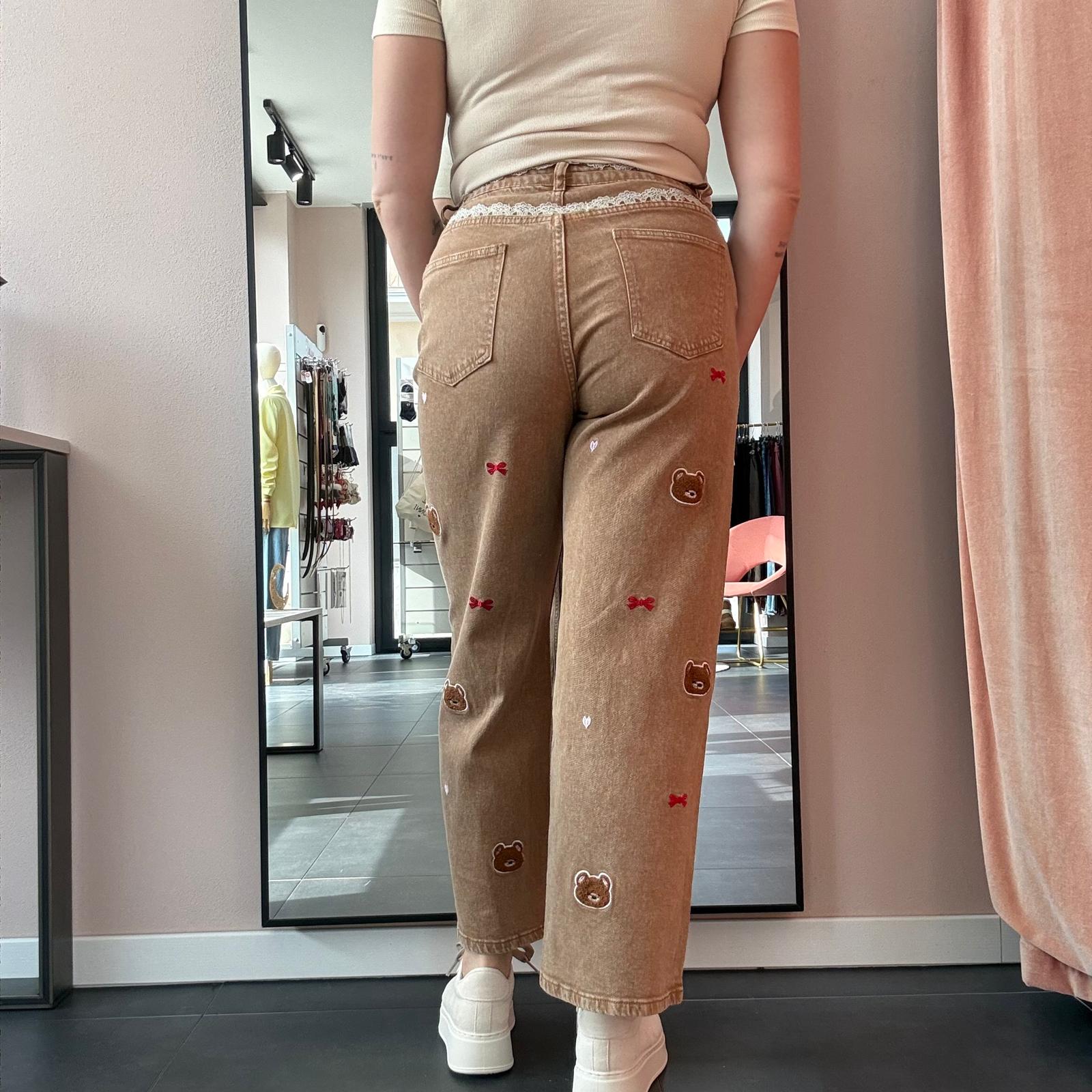 Un capo unico che unisce comfort e stile: questi jeans marroni in cotone presentano un patch orsetto e un delicato pizzo ricamato sulle cuciture superiori, in vita e sulle tasche, per un tocco femminile e originale.