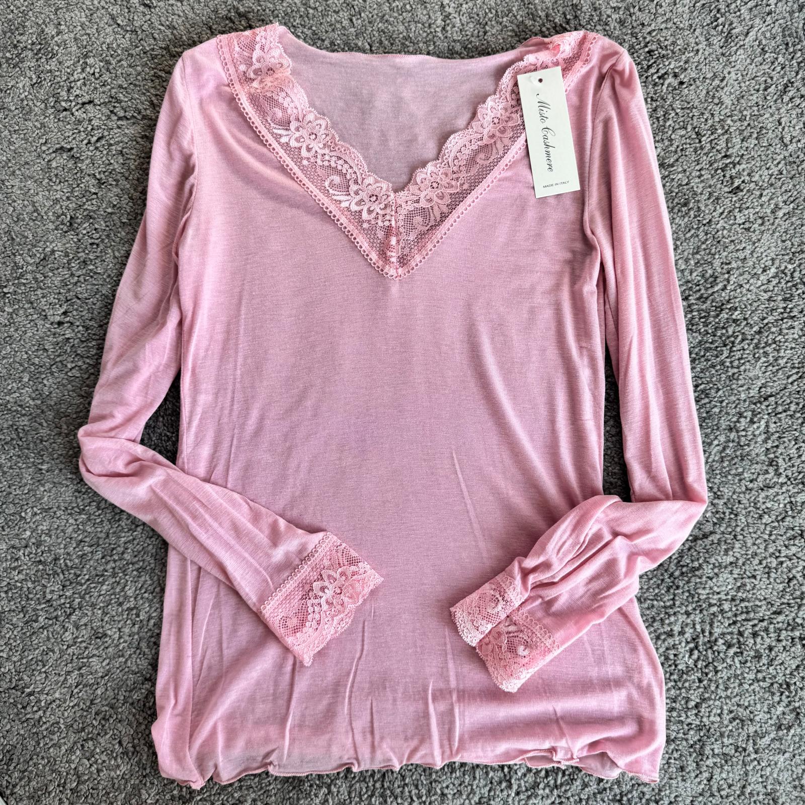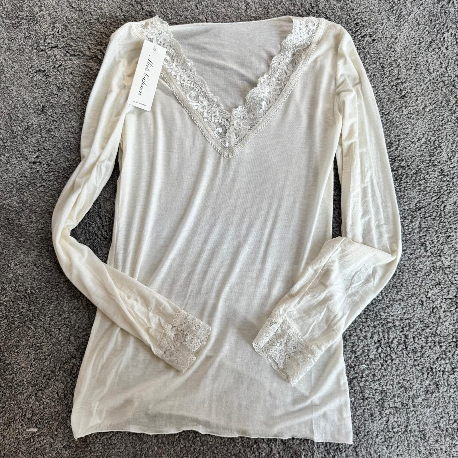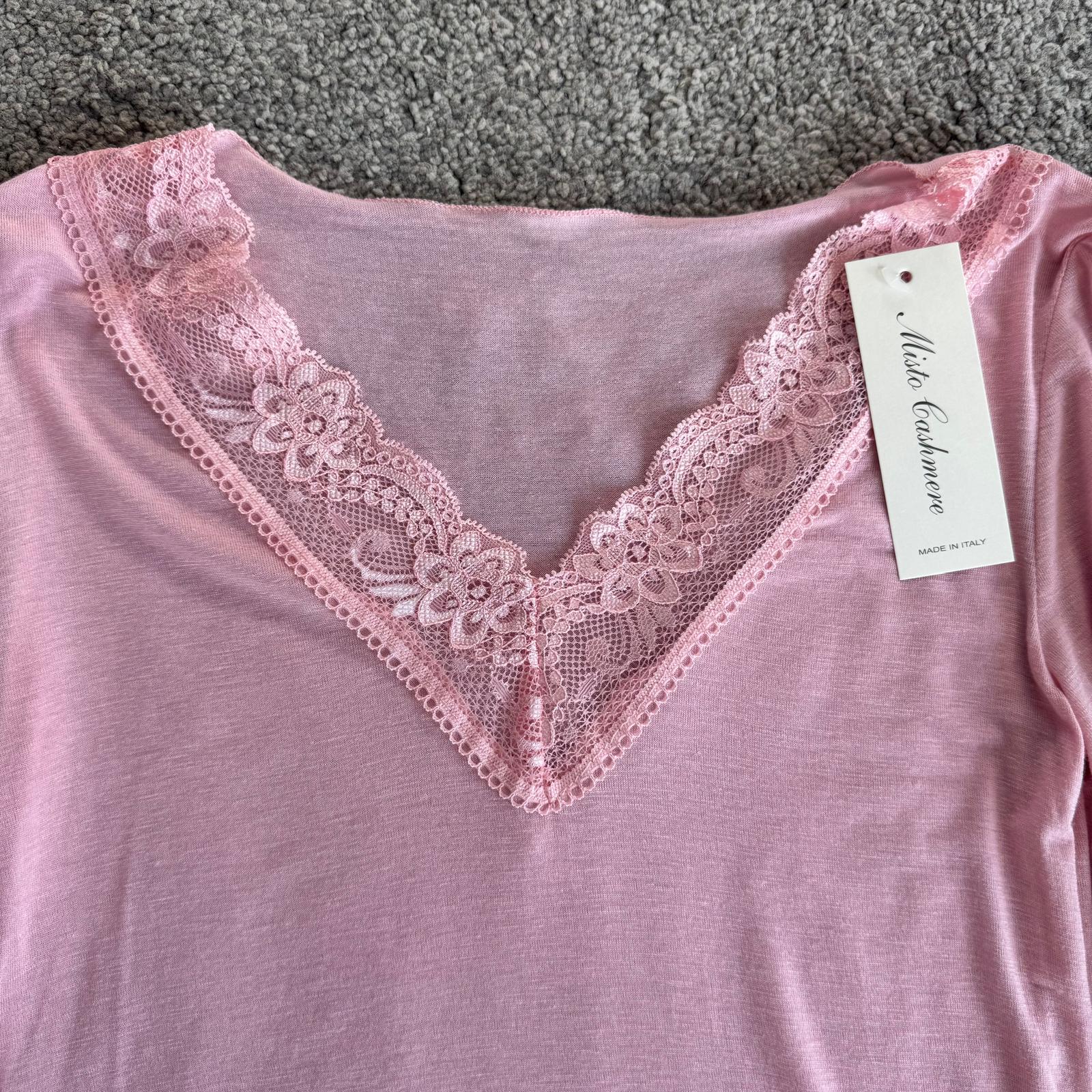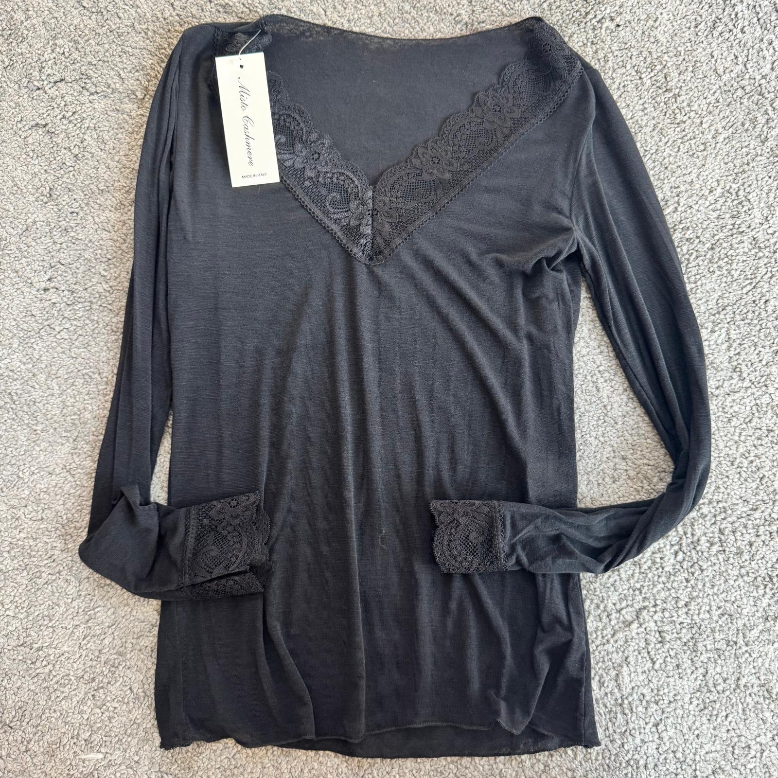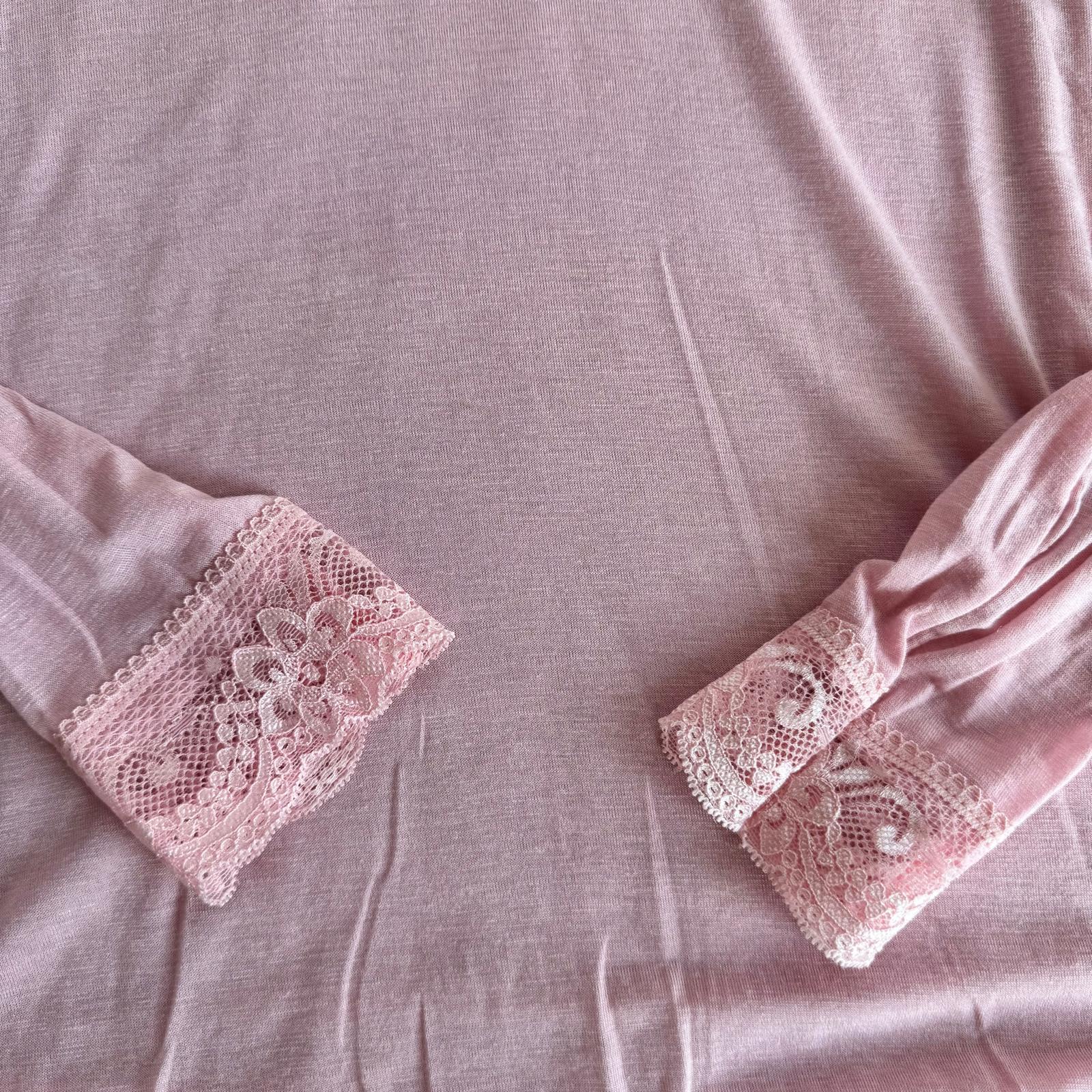 Modello con scollo a V rifinito in pizzo e dettagli in pizzo anche sui polsini, per un tocco femminile e raffinato.