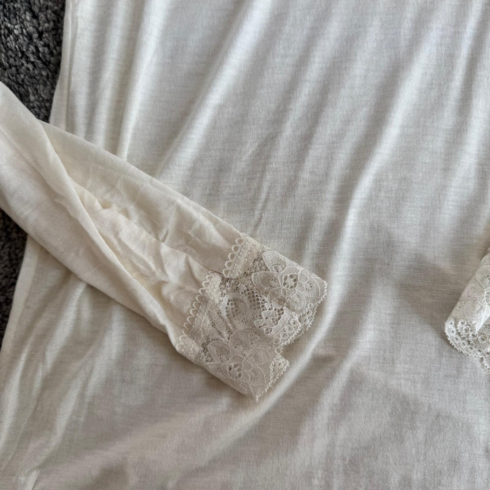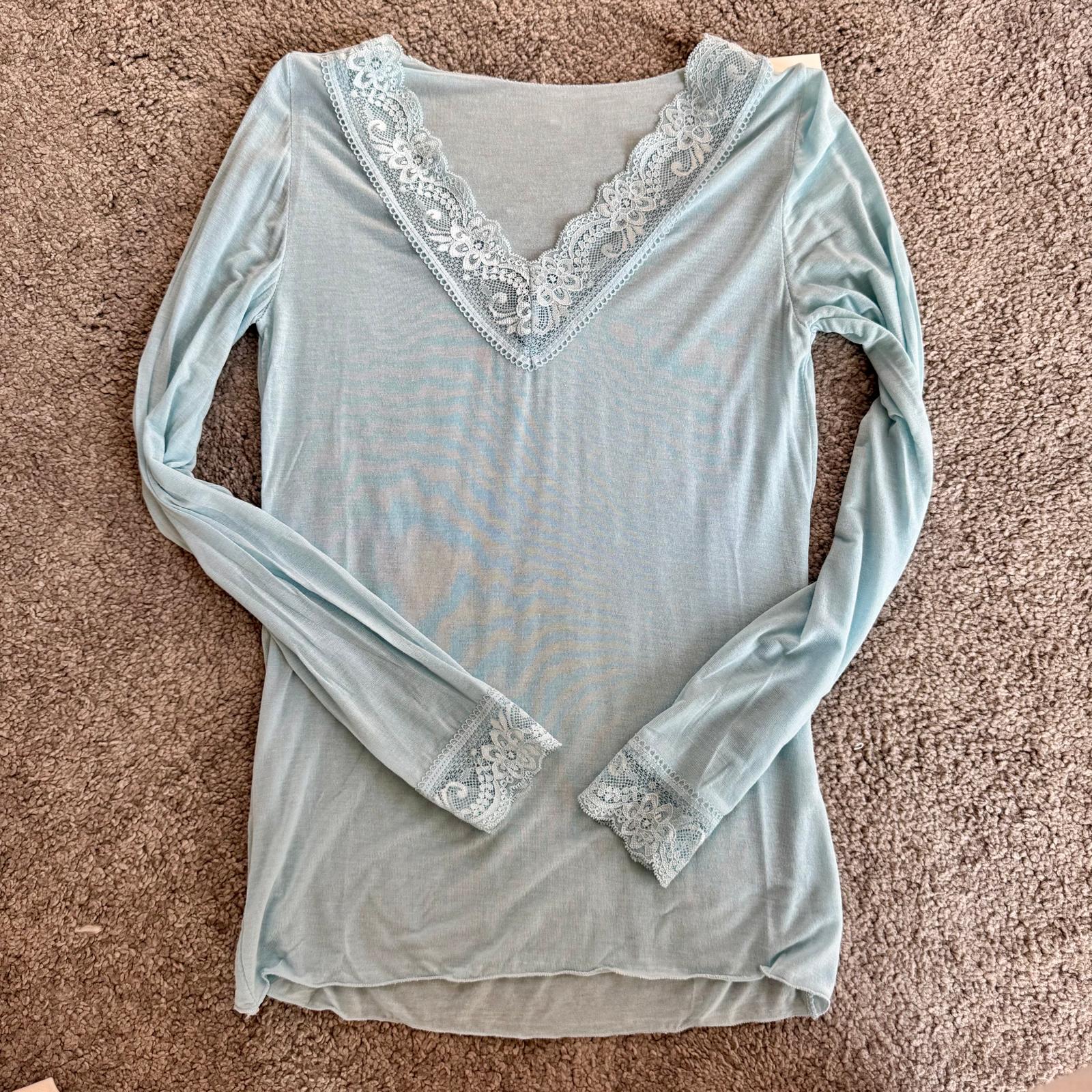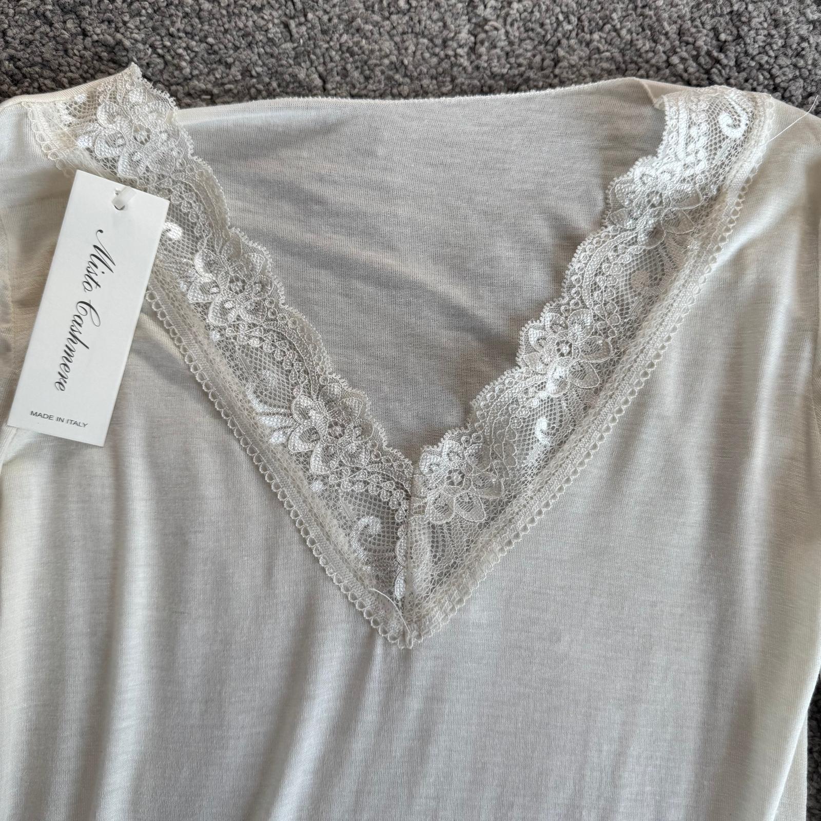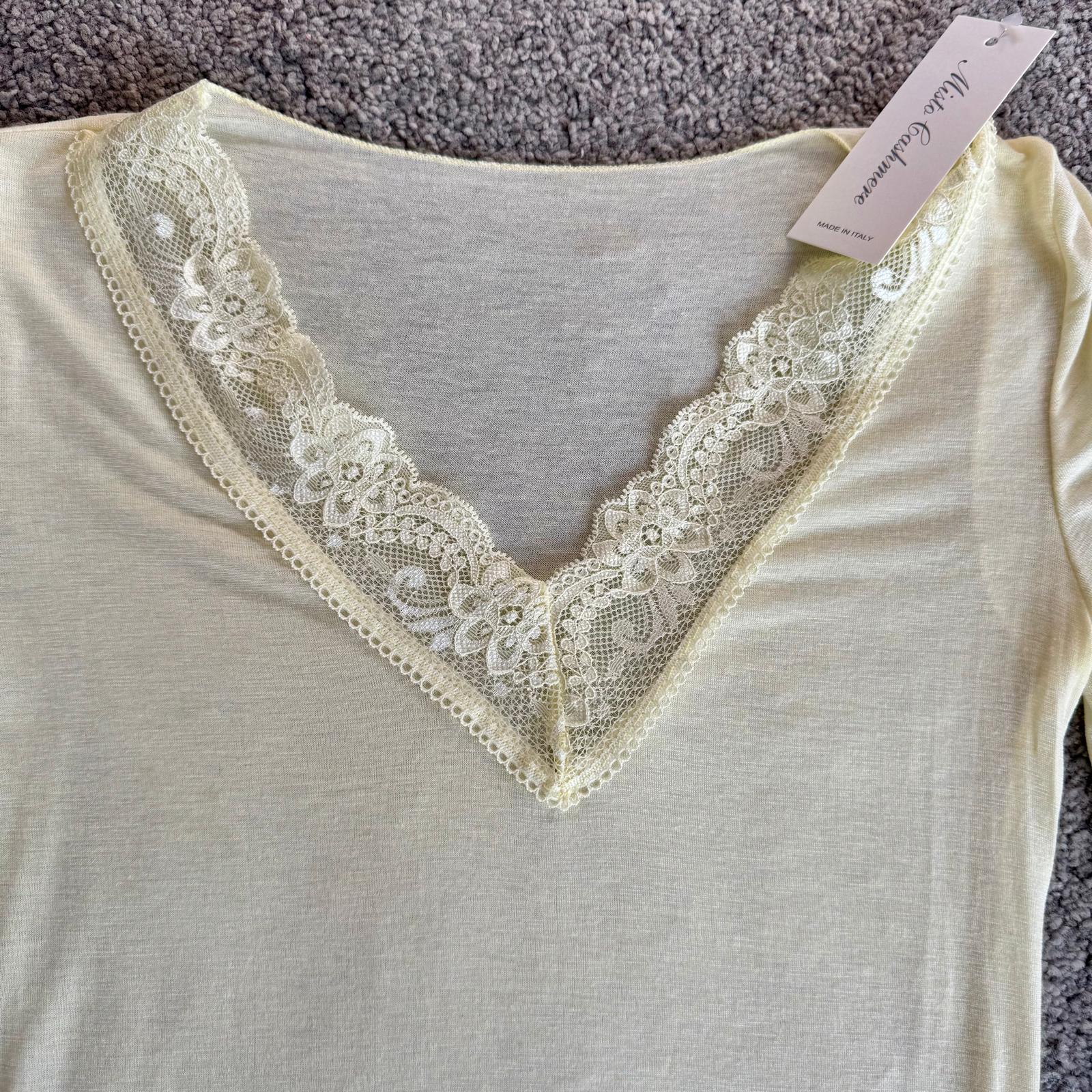 Modello con scollo a V rifinito in pizzo e dettagli in pizzo anche sui polsini, per un tocco femminile e raffinato.