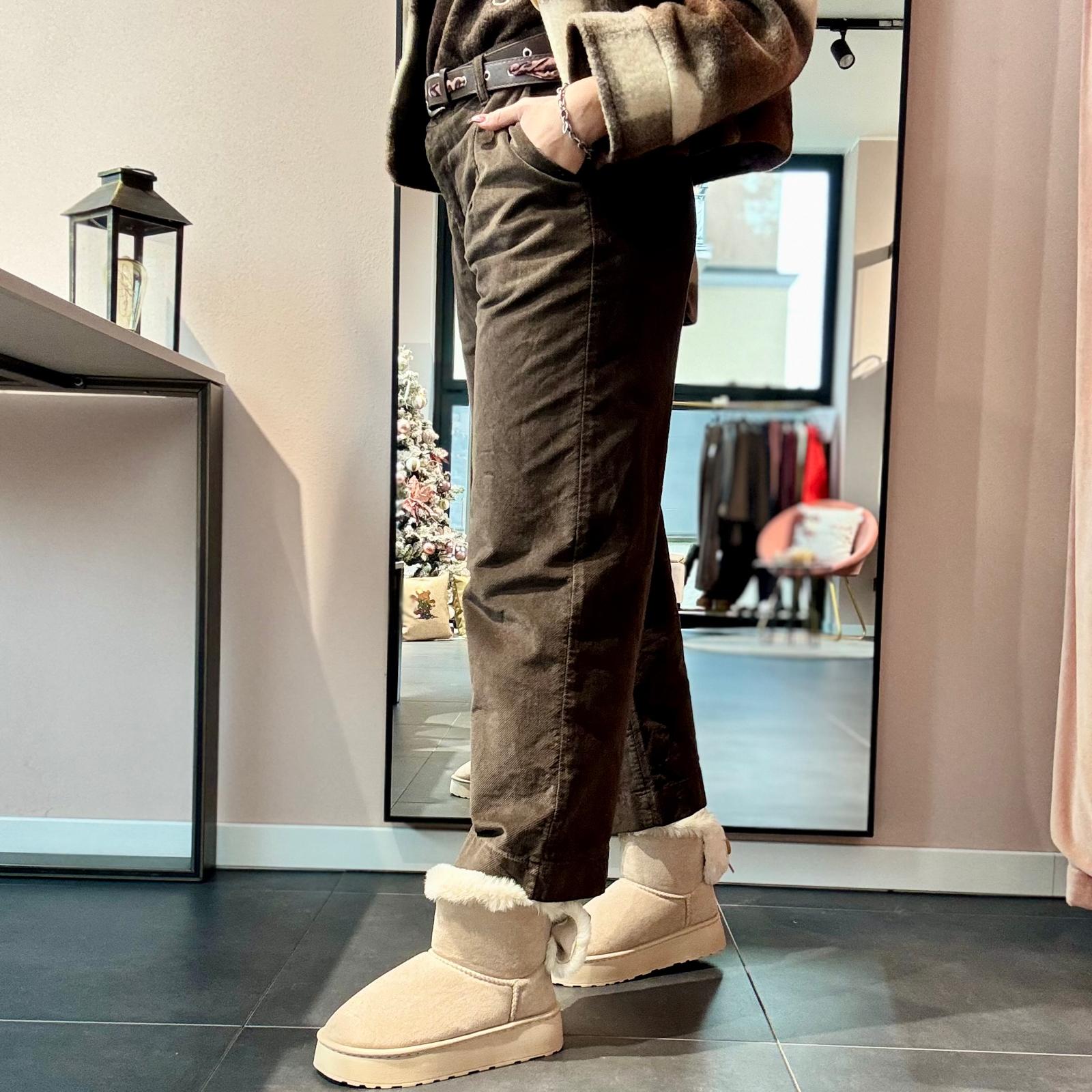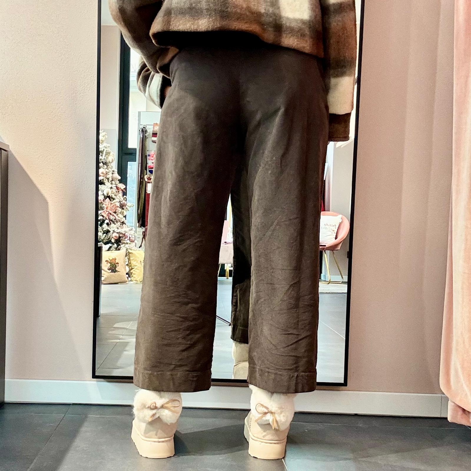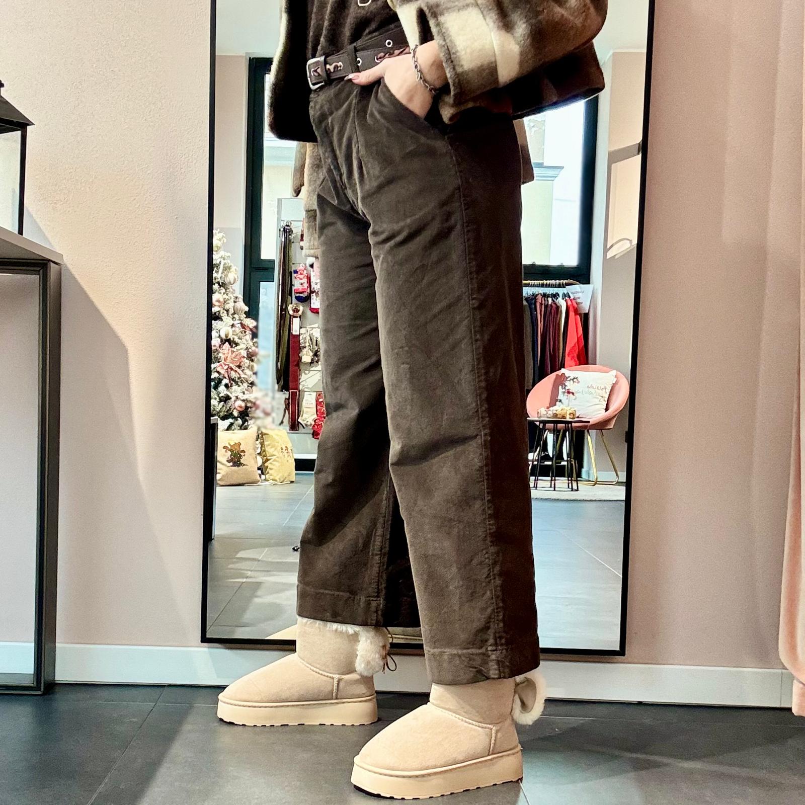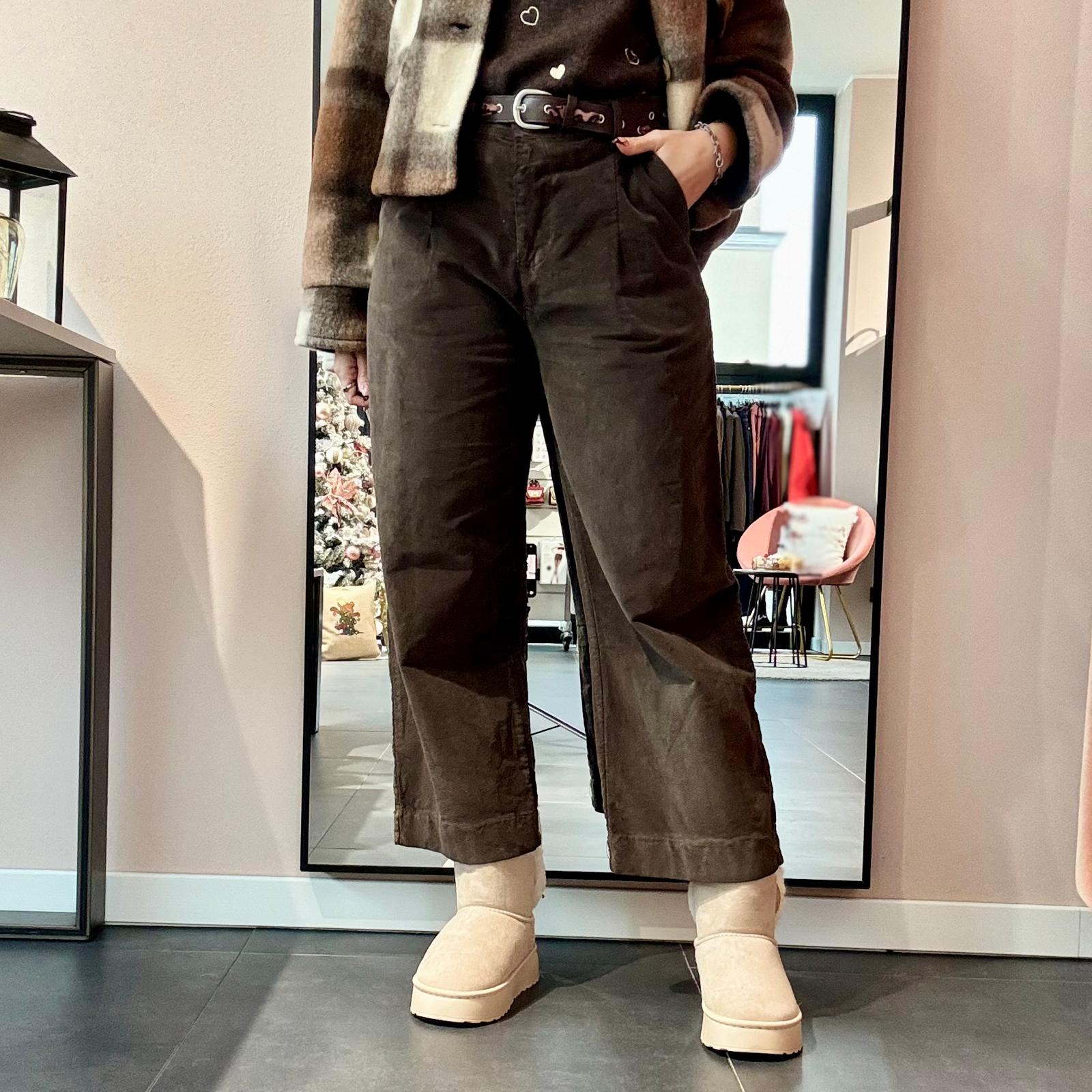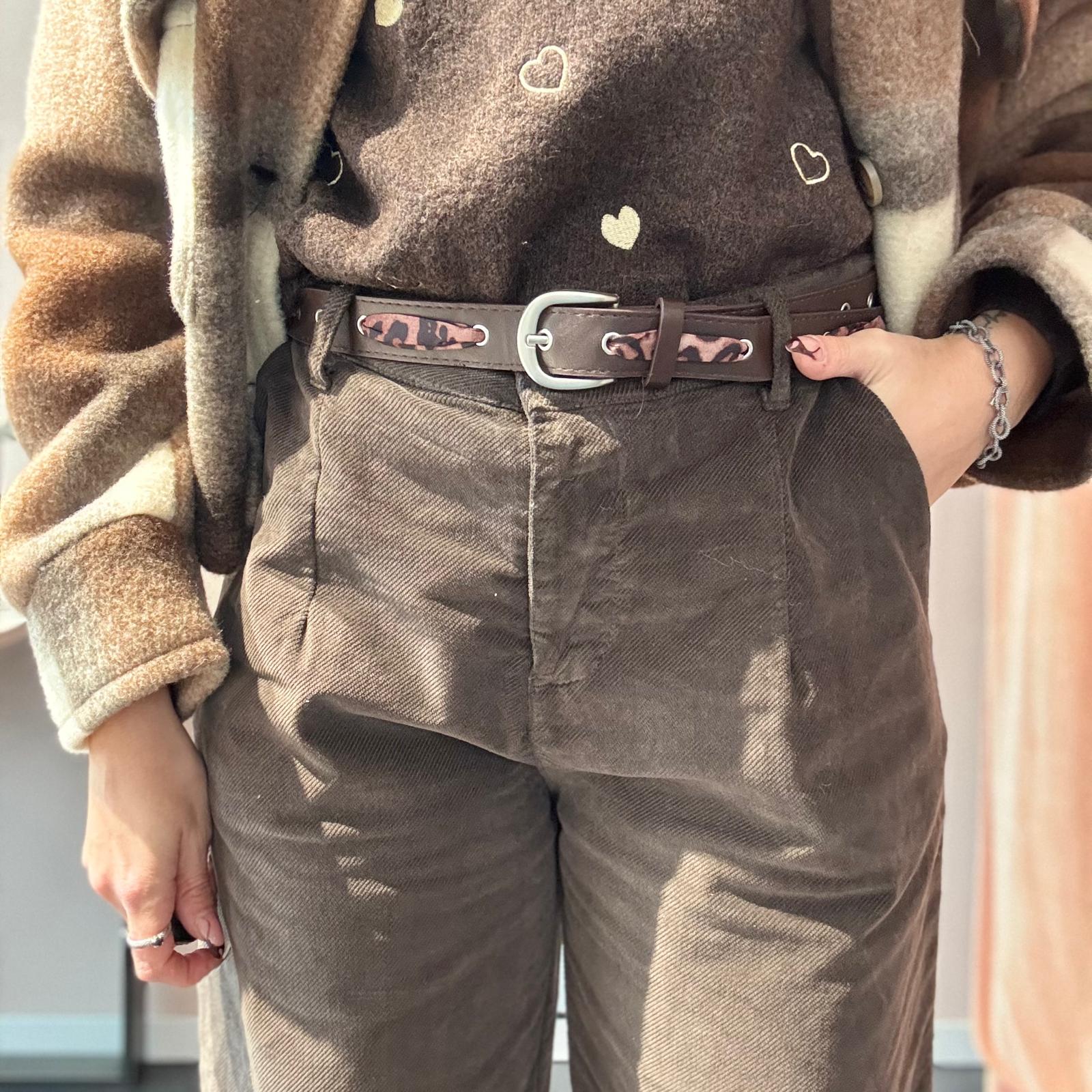 Pantalone in morbido tessuto scamosciato a costine strette, modello leggermente baggy con cavallo morbido e vita alta. La gamba dritta garantisce comfort e versatilità. Completo di cintura in ecopelle regolabile con inserto maculato intrecciato, che aggiunge un dettaglio originale e moderno.