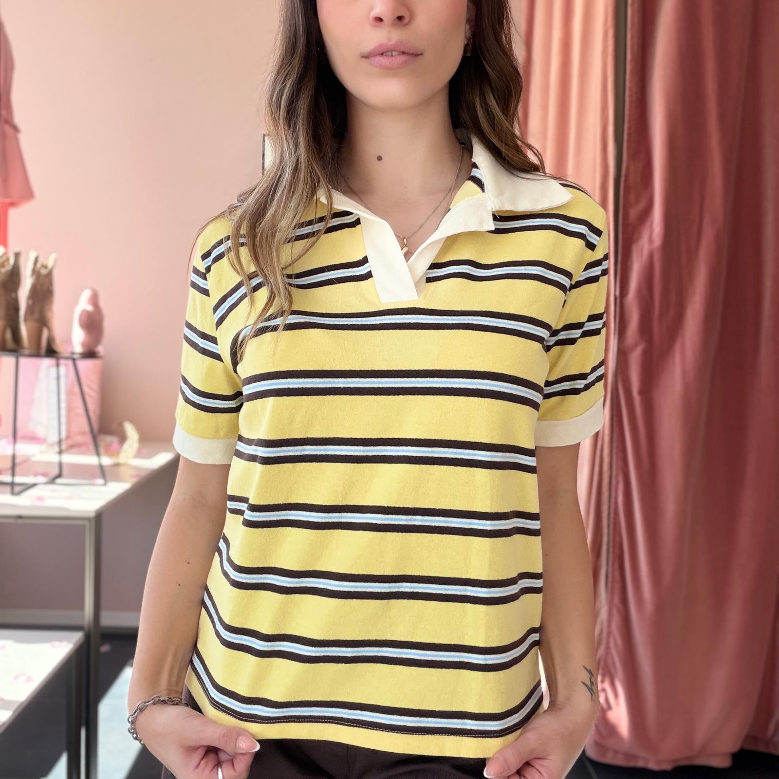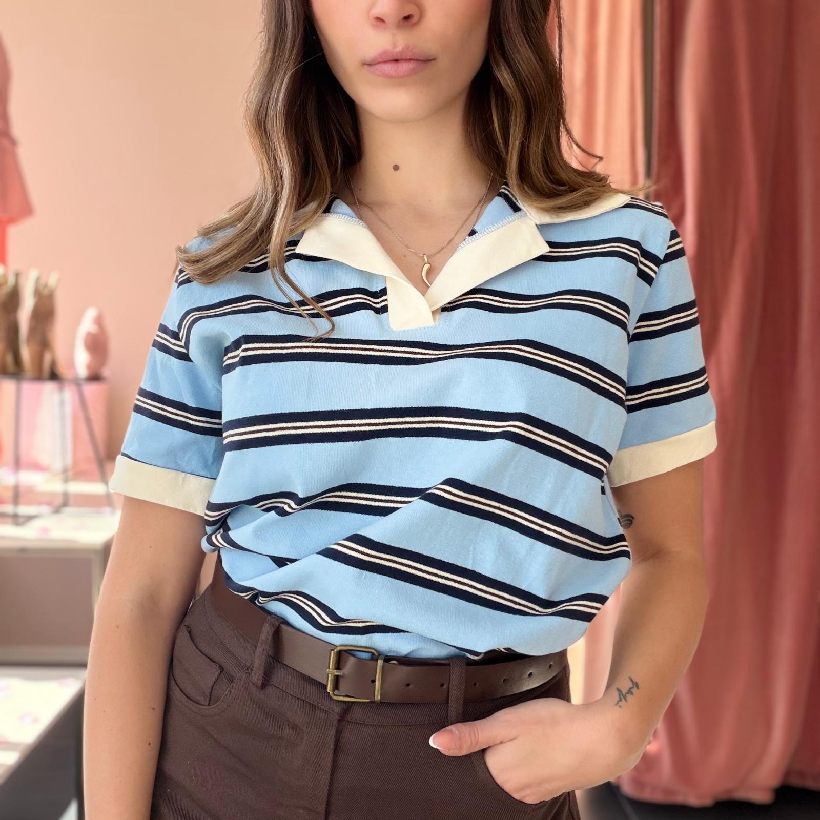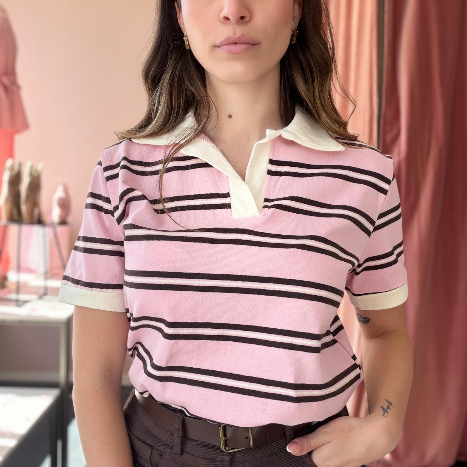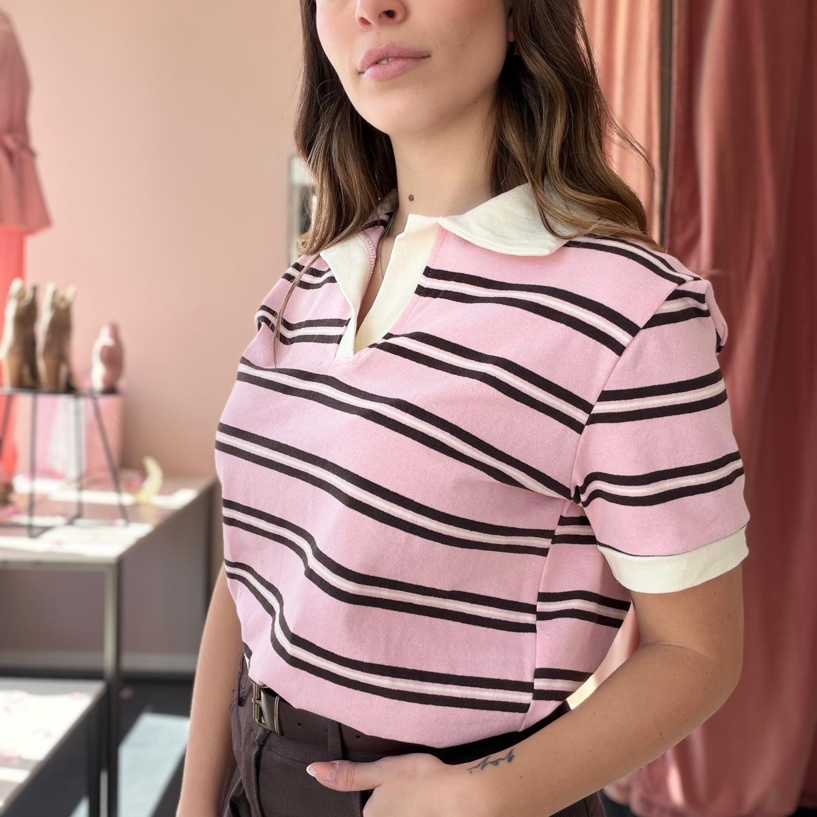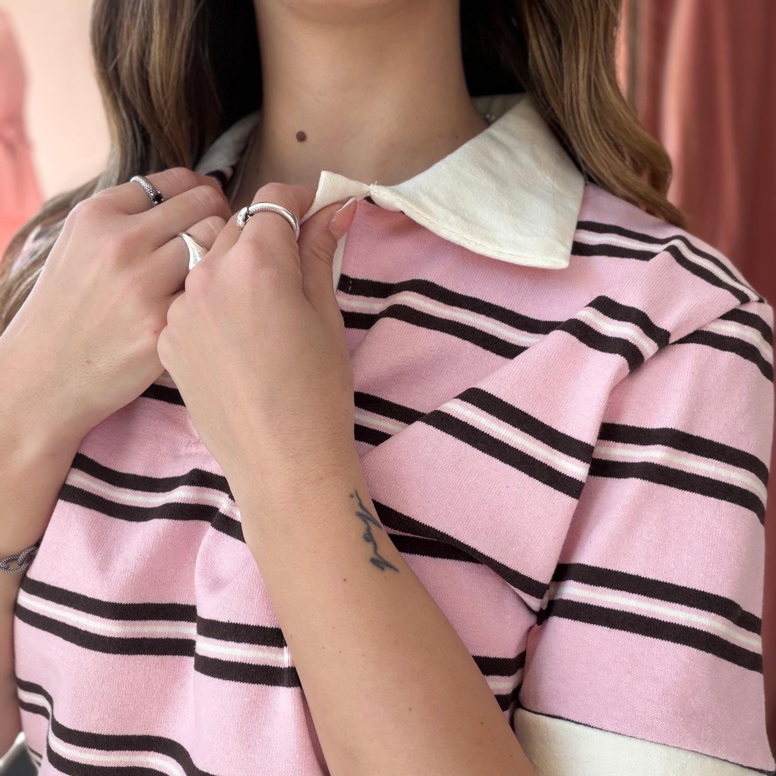 Polo in cotone ben strutturato a righe, caratterizzata da un elegante colletto bianco che dona un tocco raffinato al capo. Il design a manica corta e la linea leggermente ampia garantiscono comfort e uno stile casual curato.