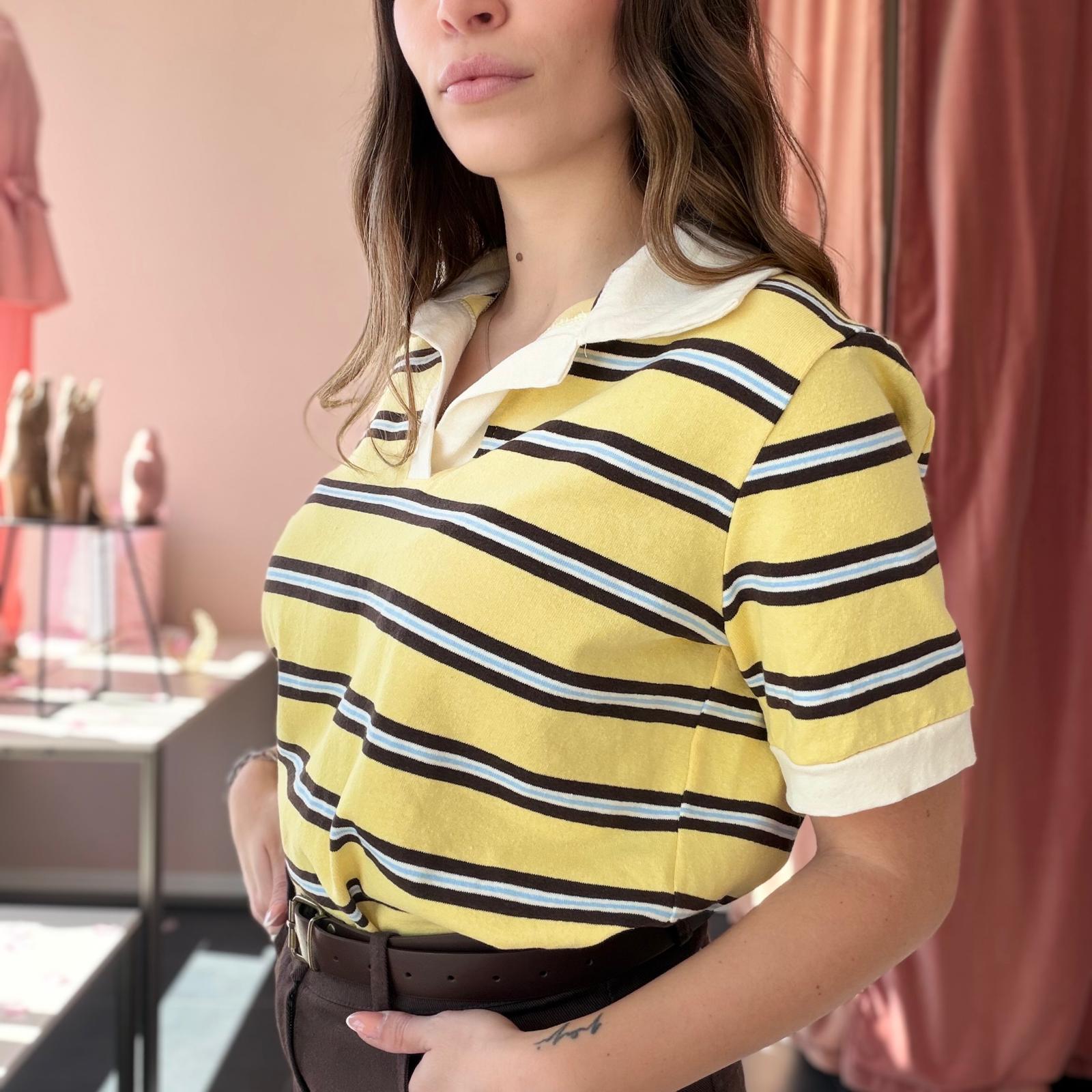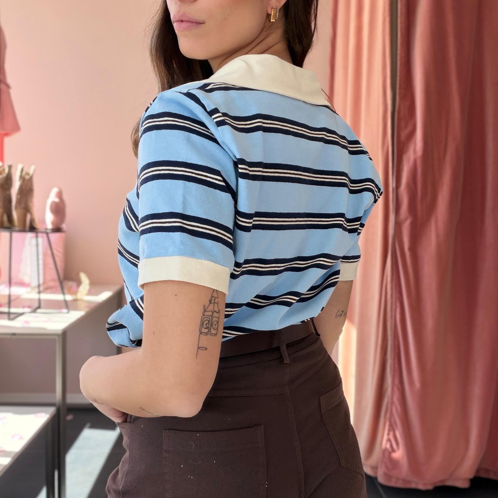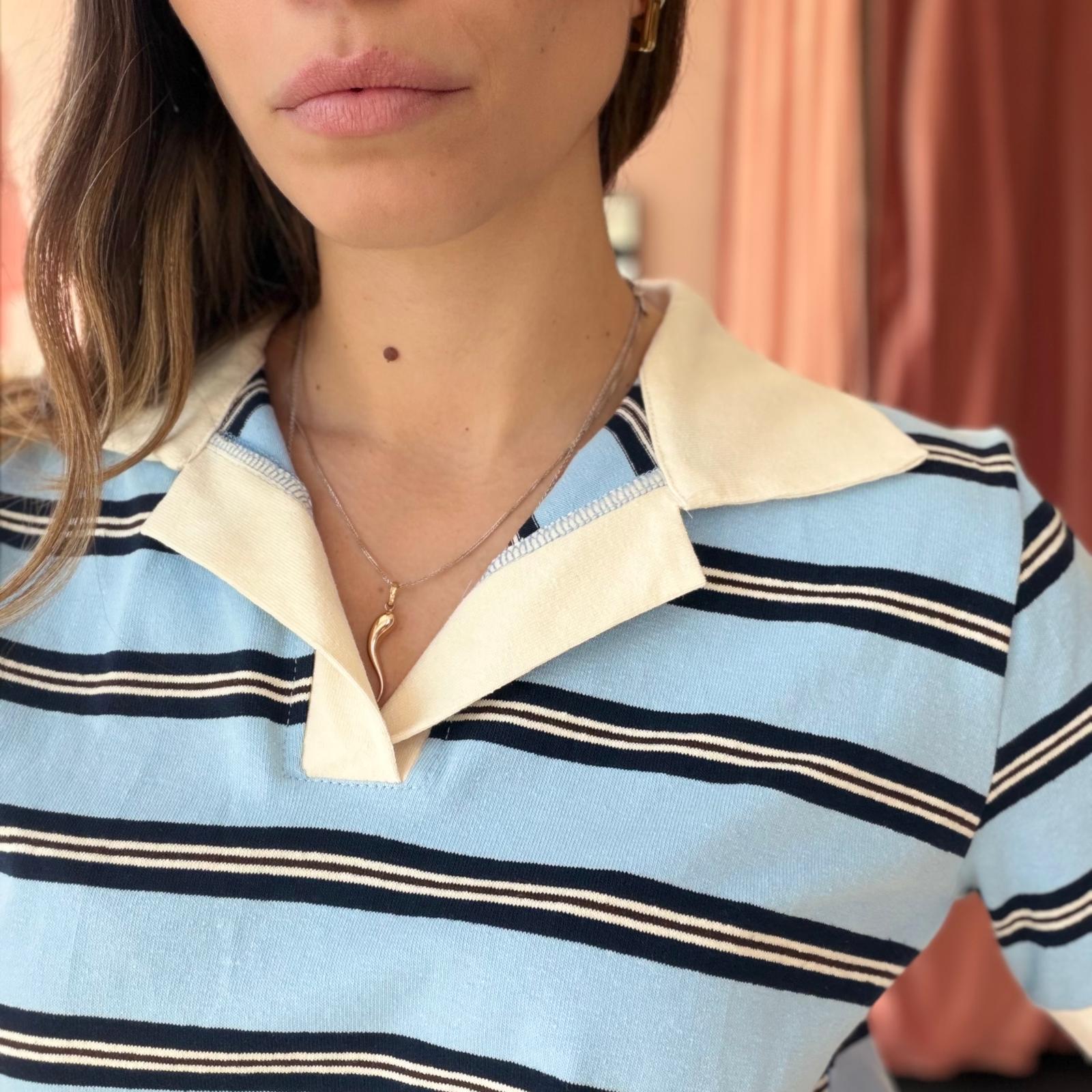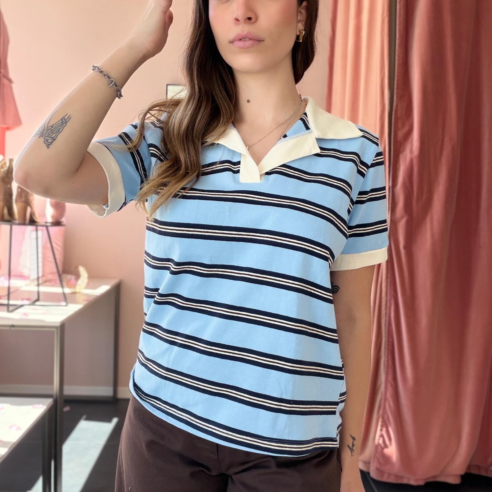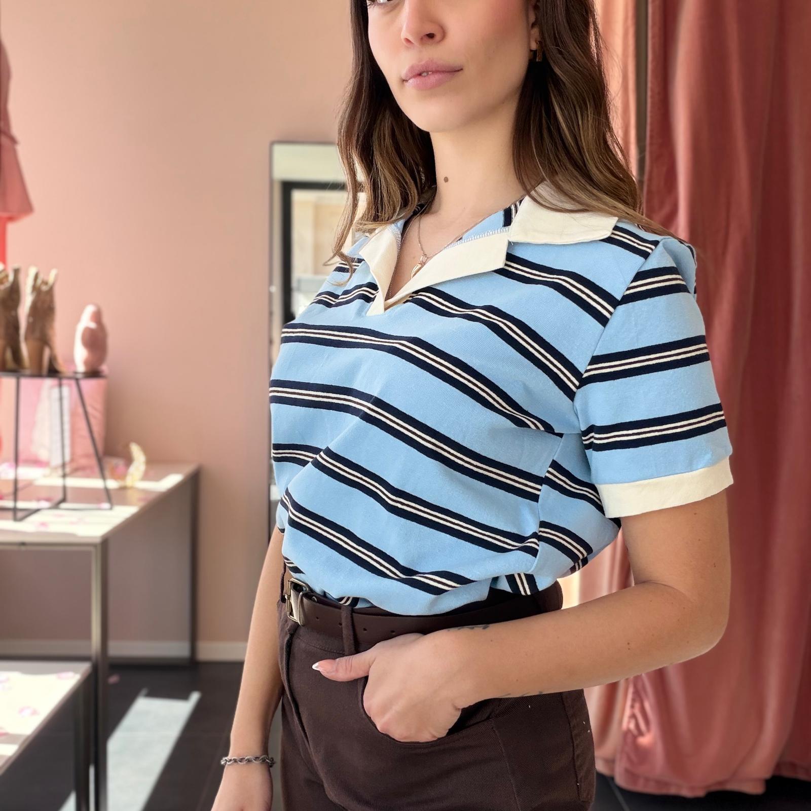 Polo in cotone ben strutturato a righe, caratterizzata da un elegante colletto bianco che dona un tocco raffinato al capo. Il design a manica corta e la linea leggermente ampia garantiscono comfort e uno stile casual curato.