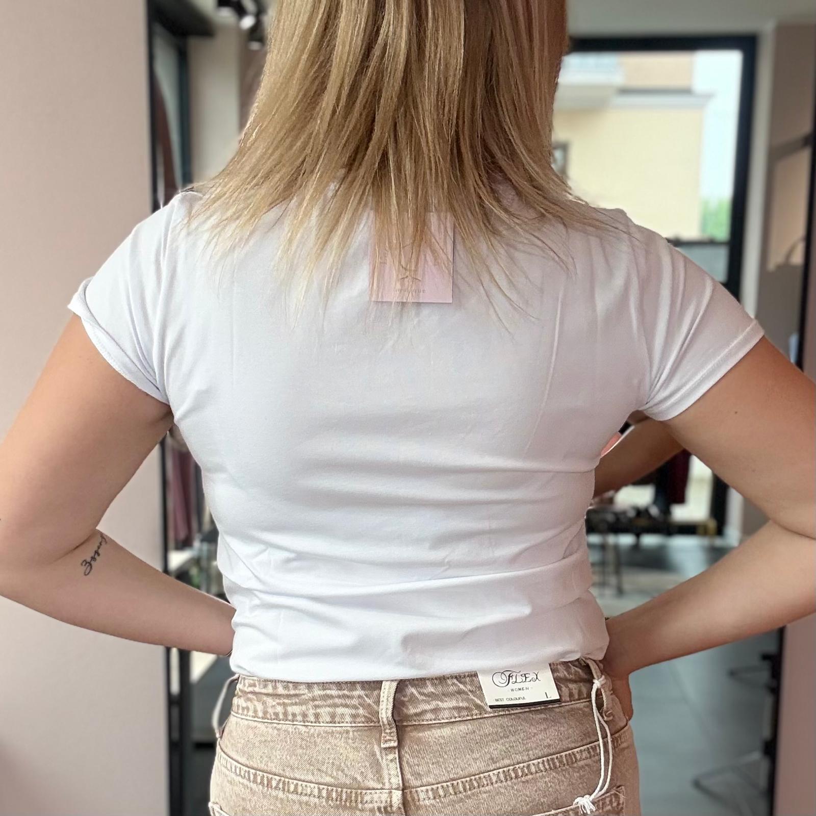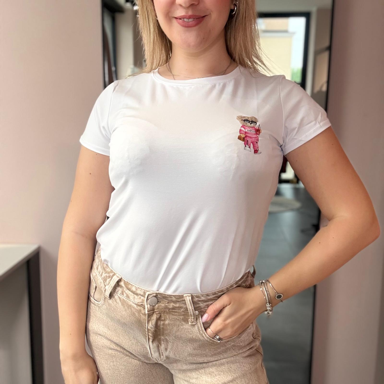 T-shirt bianca in cotone elasticizzato con piccolo orsetto applicato sul lato cuore. Un capo semplice ma curato nei dettagli, perfetto per completare outfit quotidiani con un tocco dolce e originale.