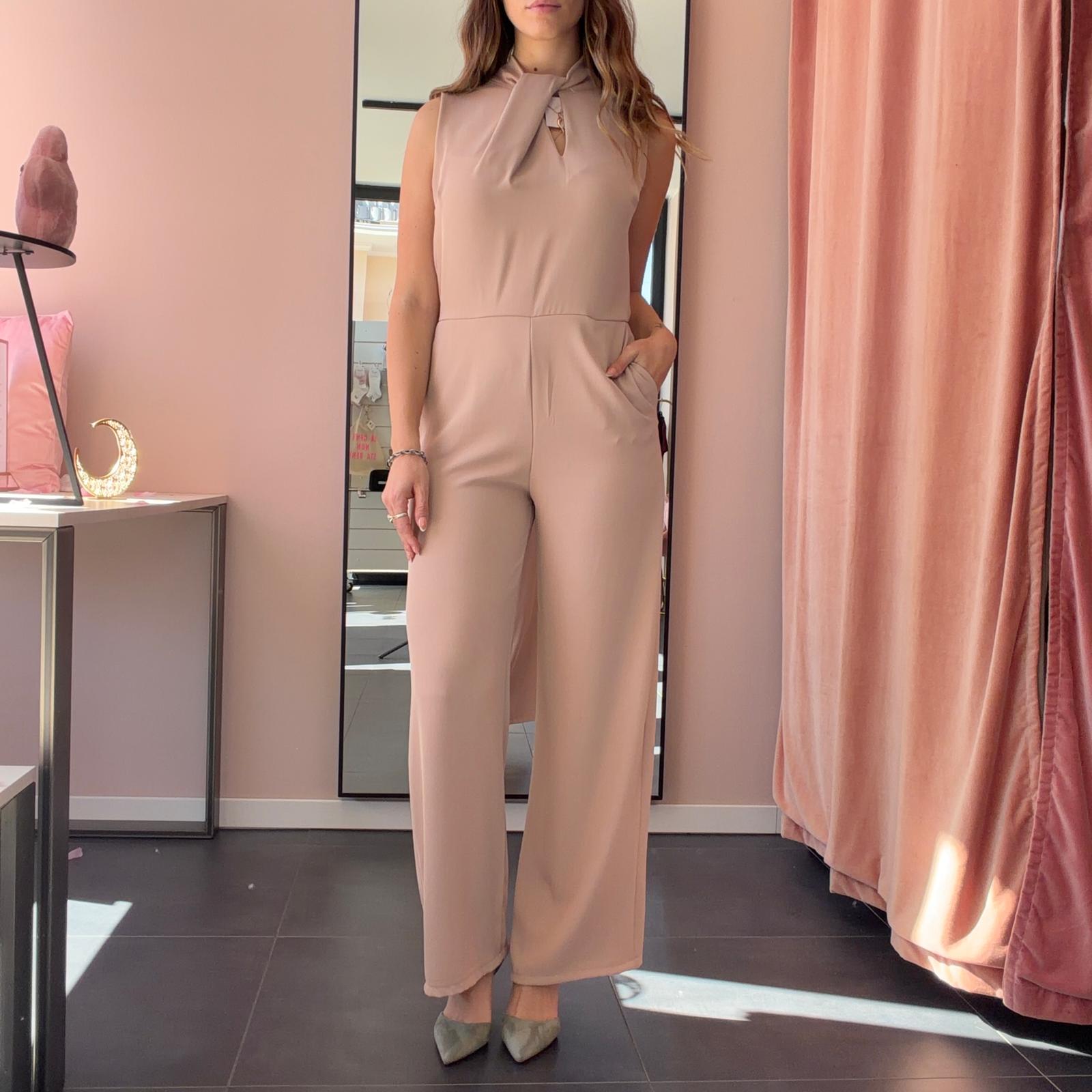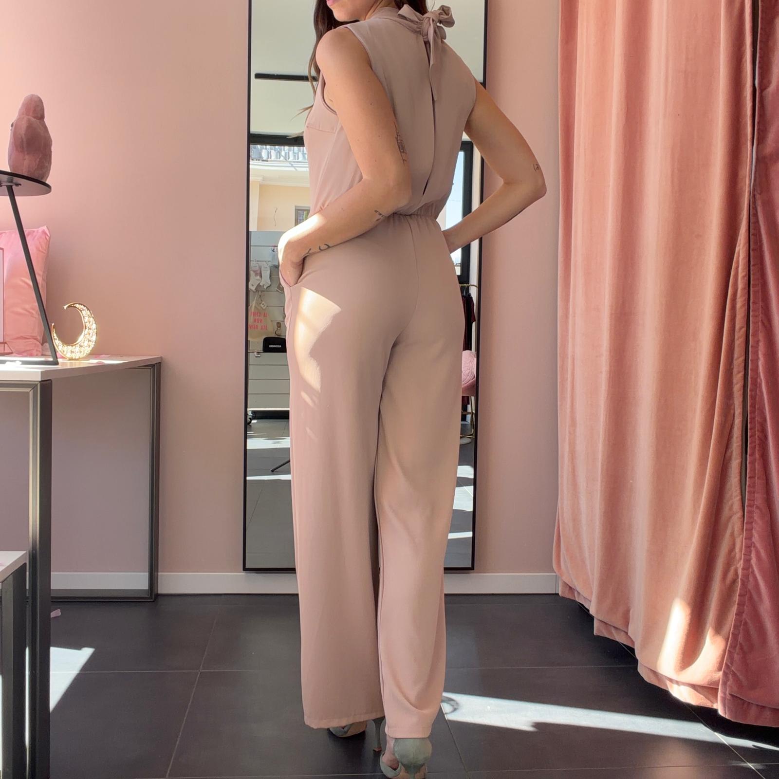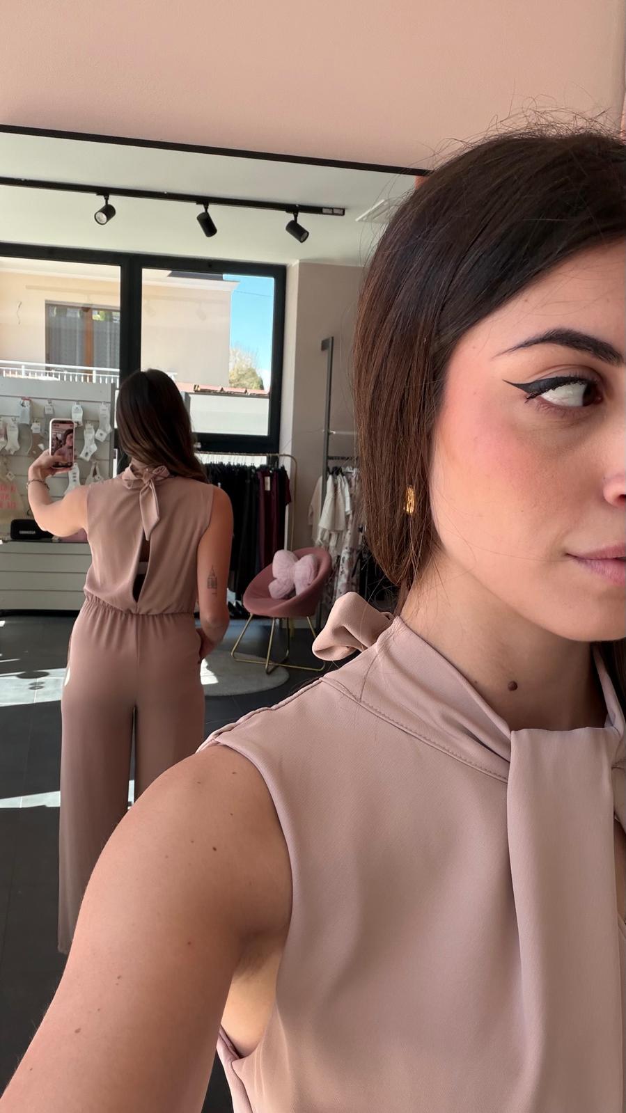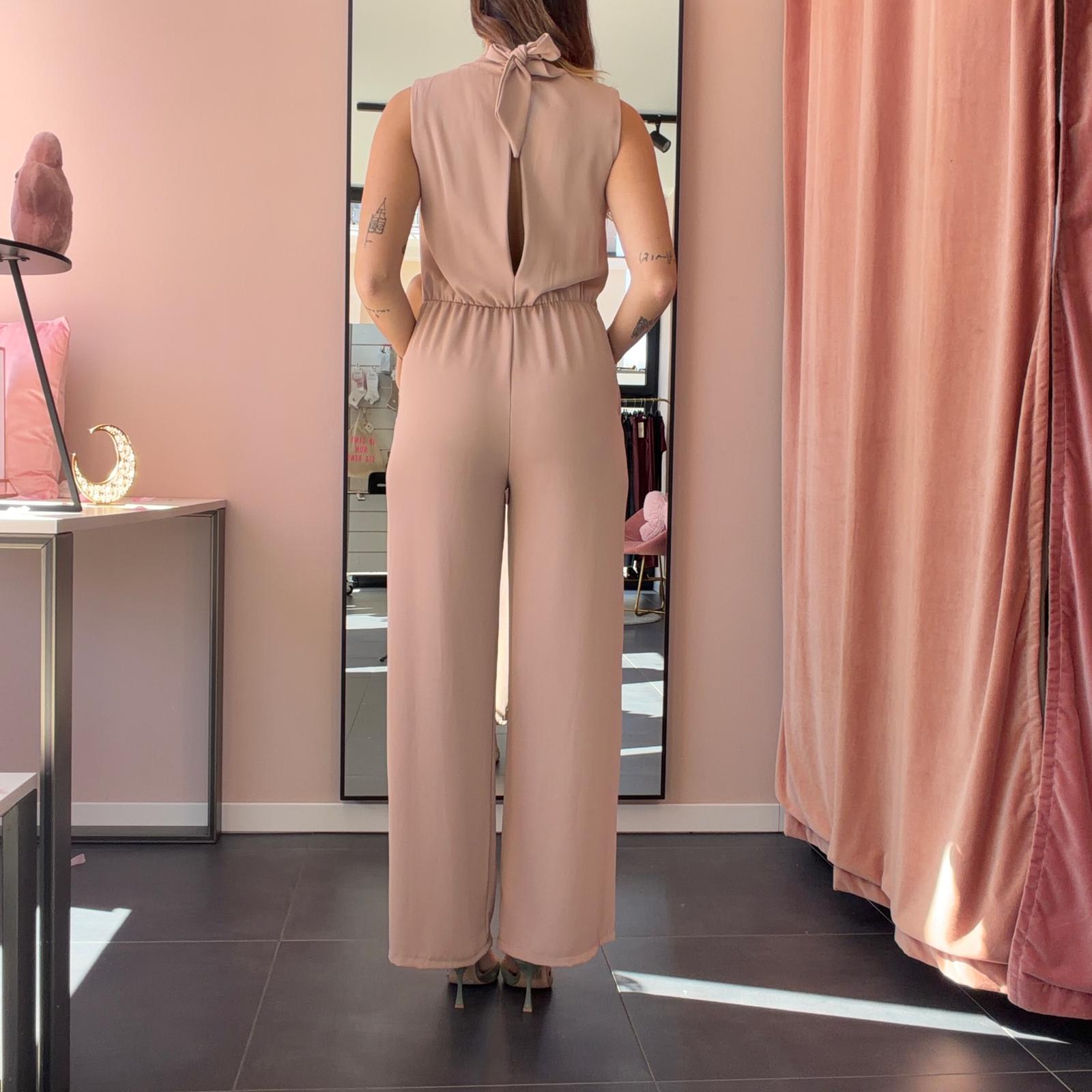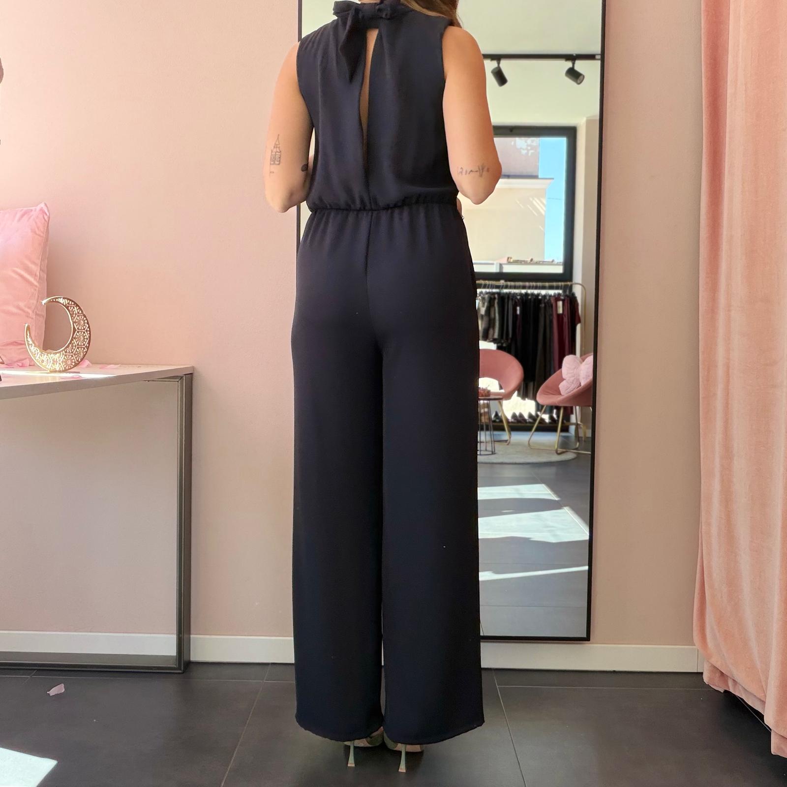 Il modello presenta gamba larga, elastico in vita per una vestibilità valorizzante e tasche laterali che uniscono praticità e stile. Il design smanicato è arricchito da un raffinato fiocco sul retro con apertura sulla schiena, mentre sul davanti si distingue per un elegante taglio sul collo.