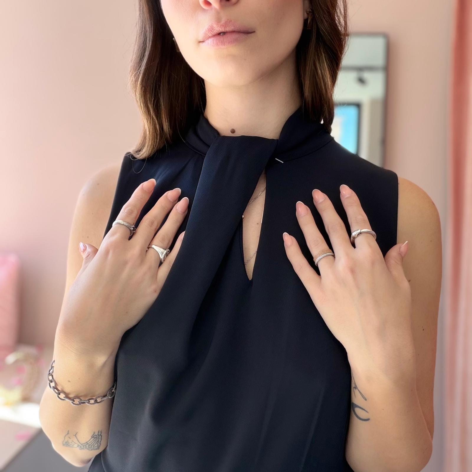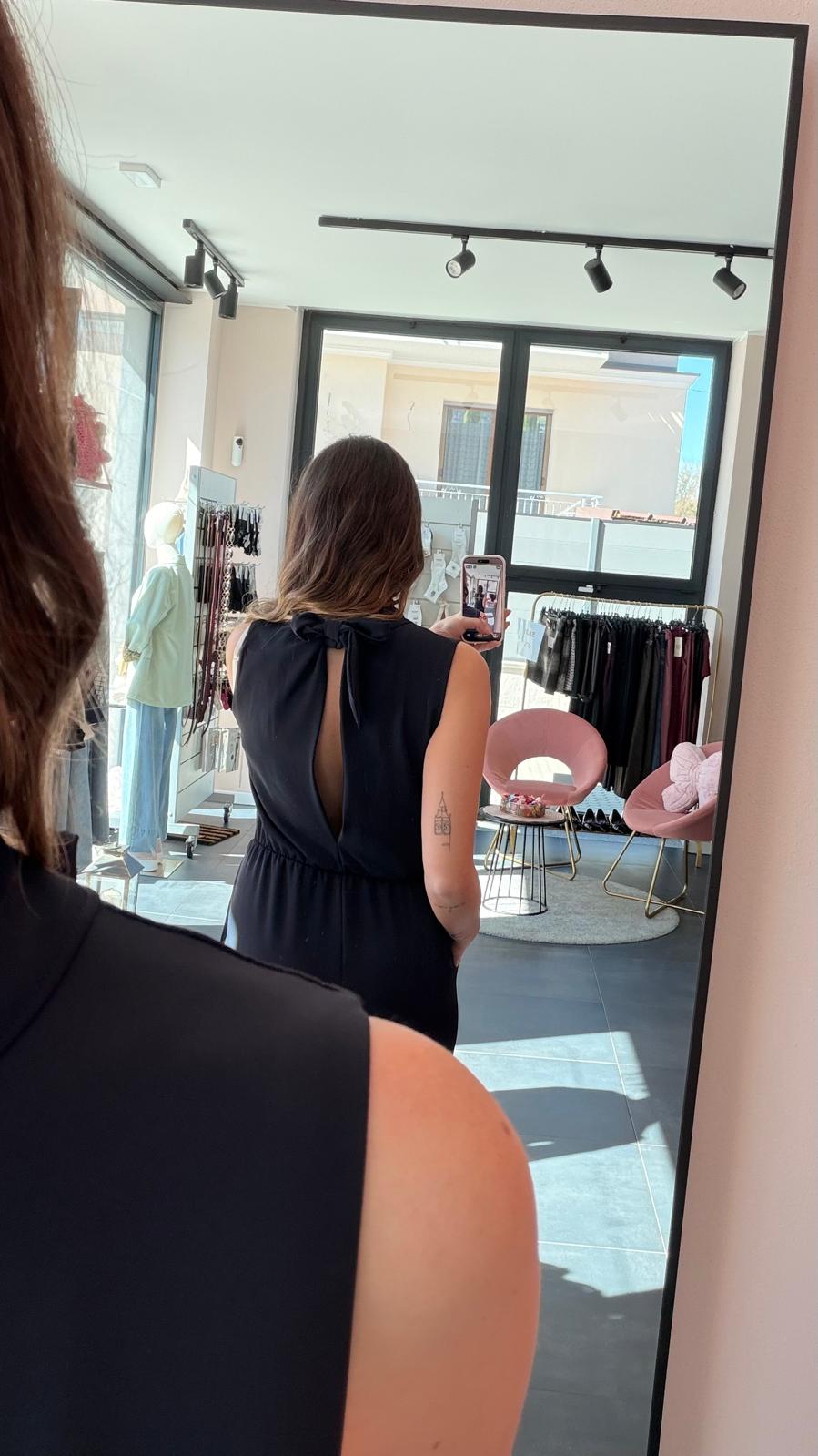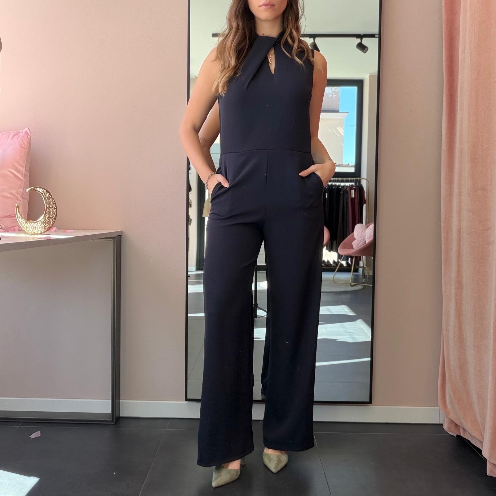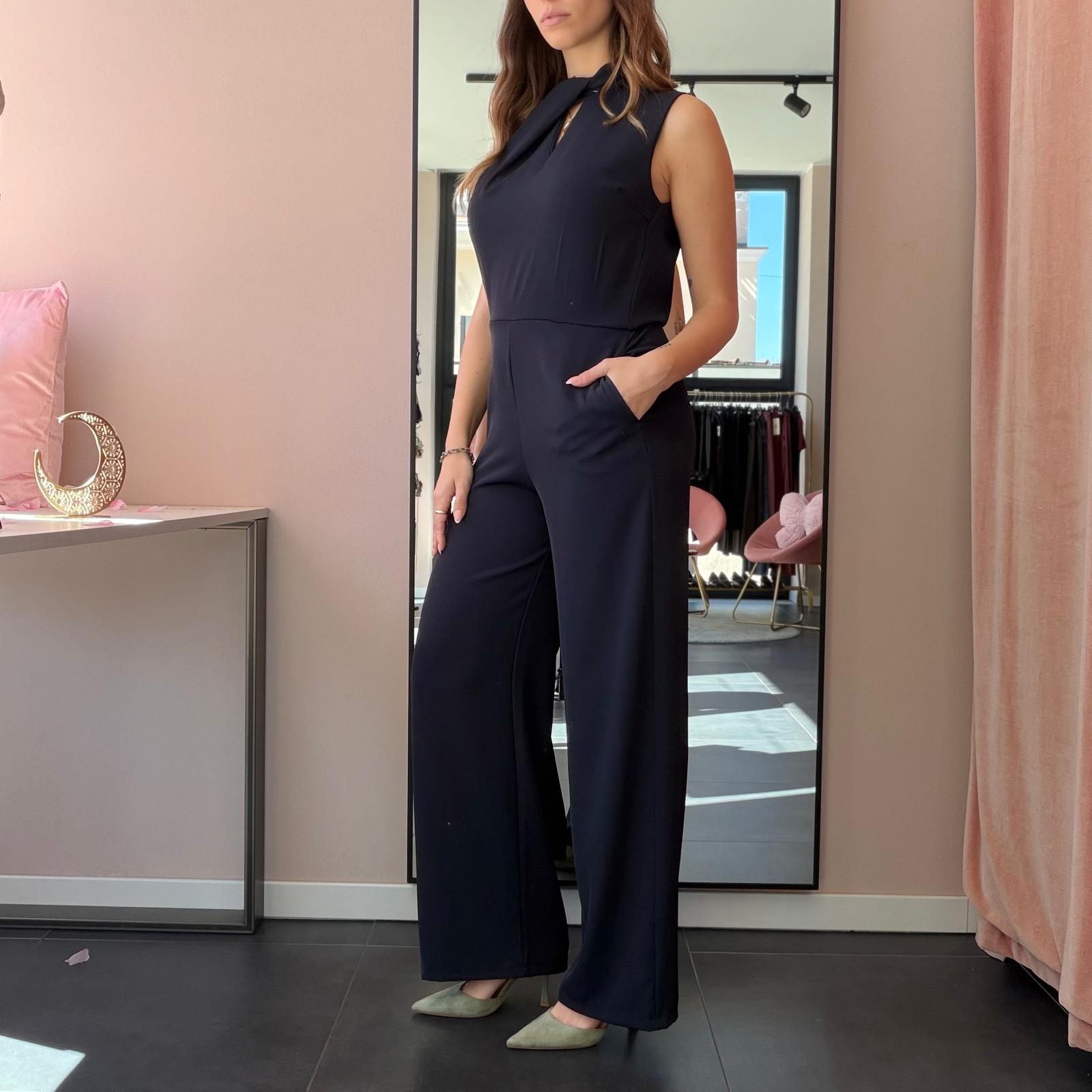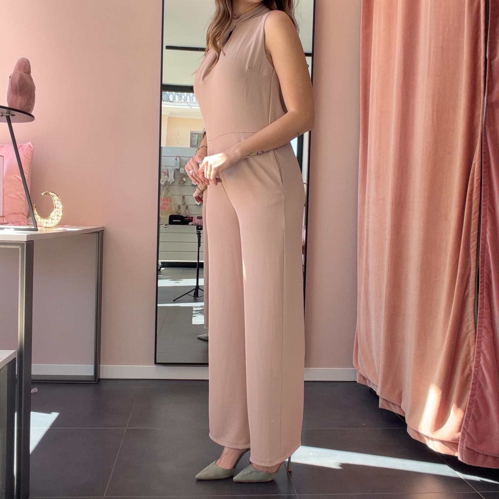 Il modello presenta gamba larga, elastico in vita per una vestibilità valorizzante e tasche laterali che uniscono praticità e stile. Il design smanicato è arricchito da un raffinato fiocco sul retro con apertura sulla schiena, mentre sul davanti si distingue per un elegante taglio sul collo.